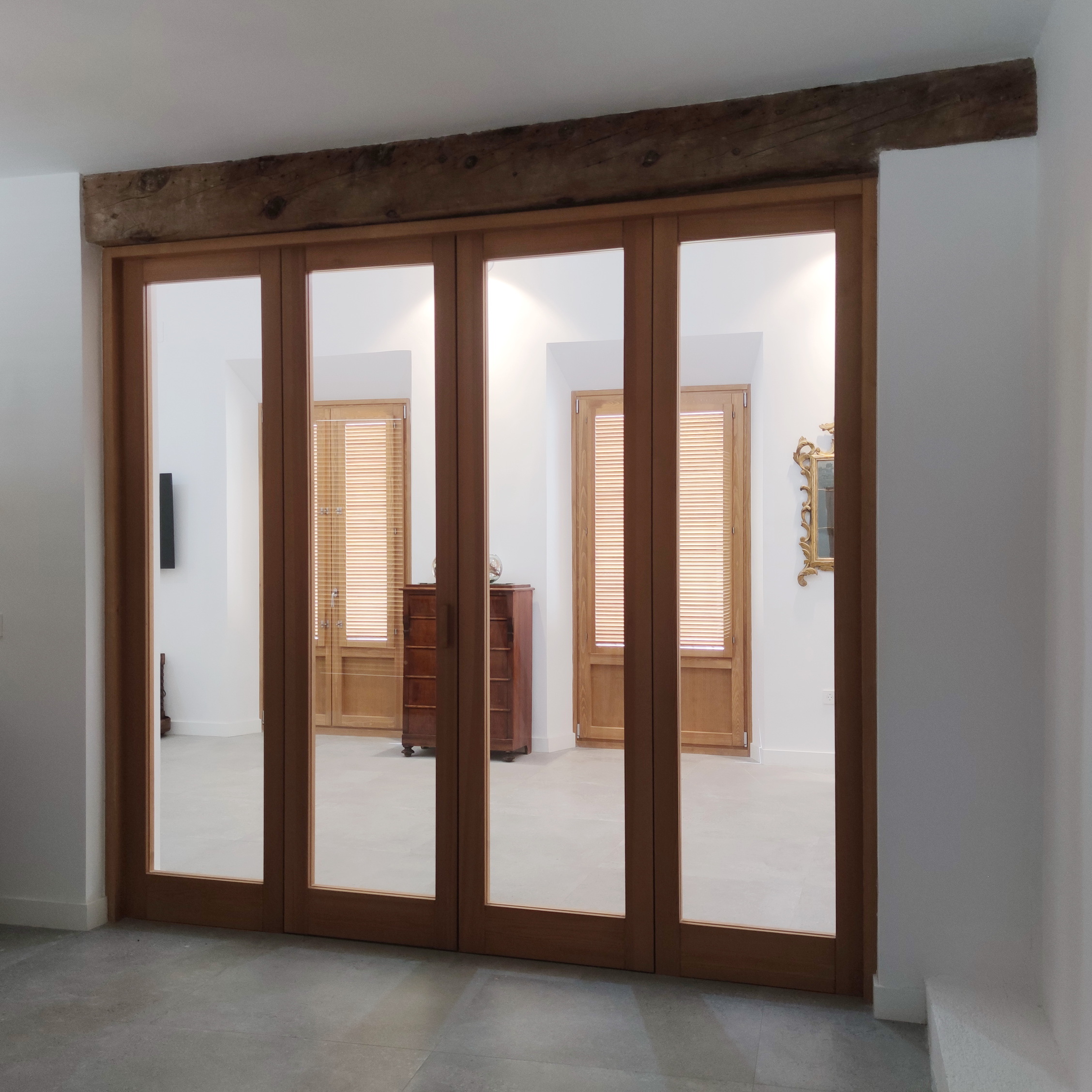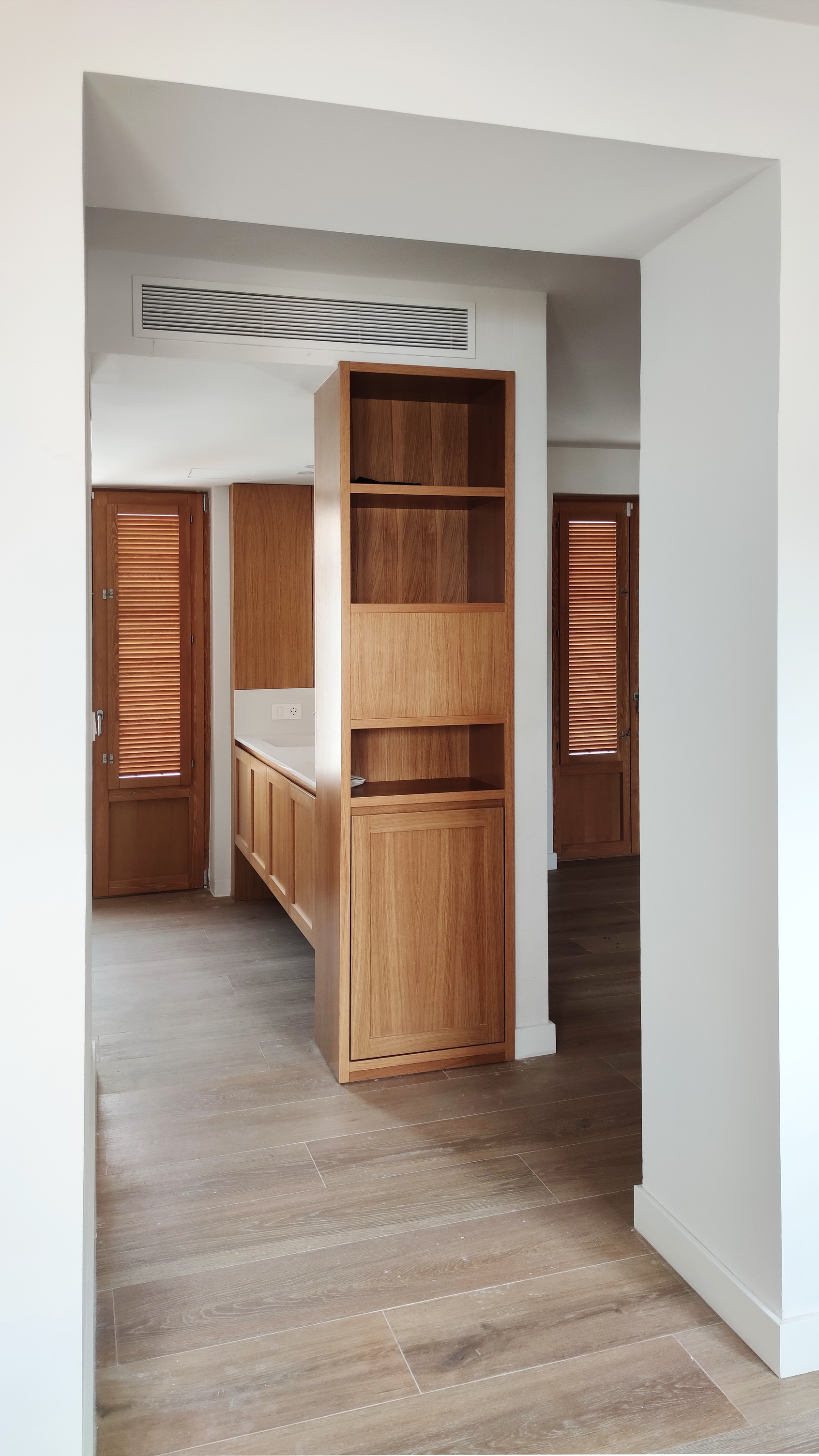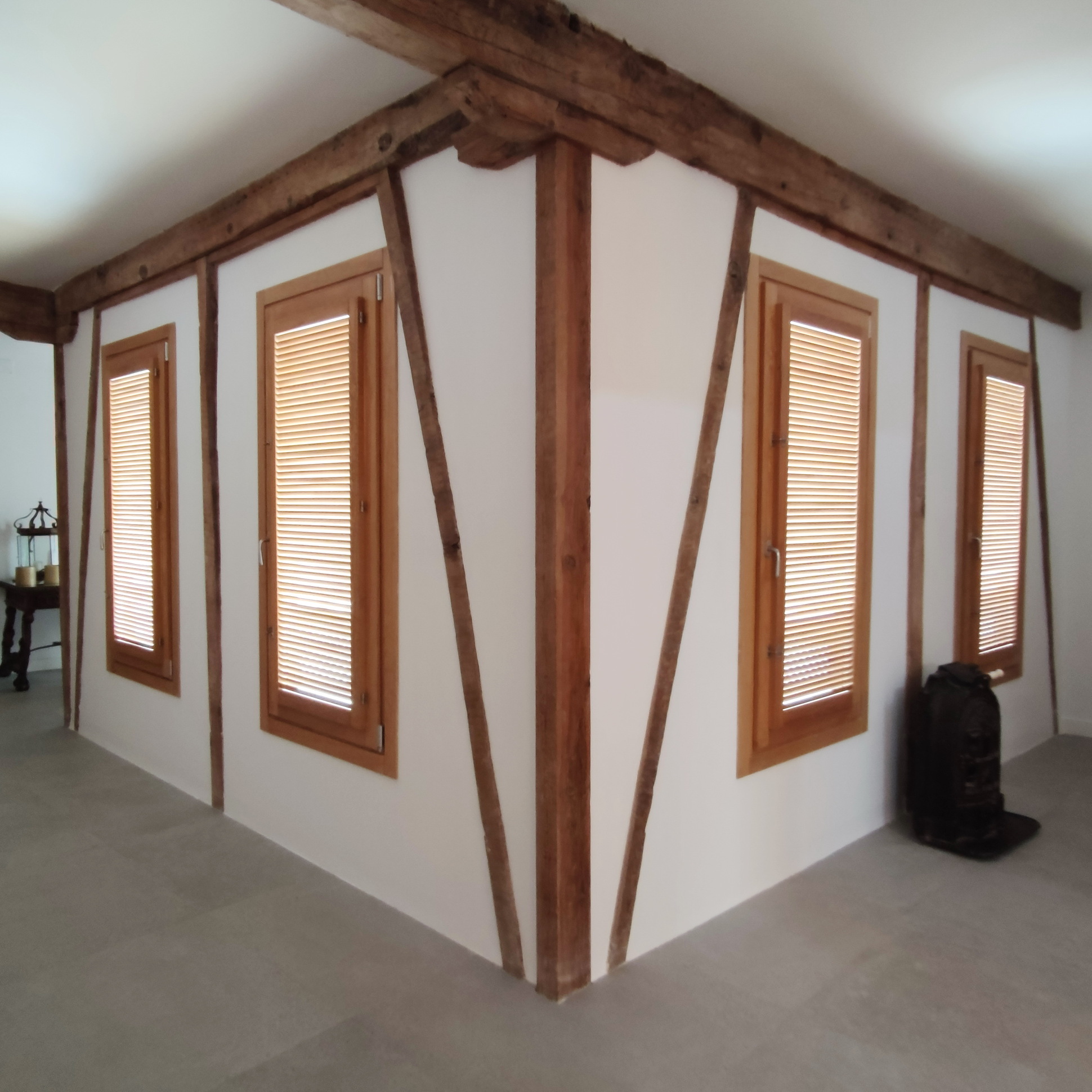 En planta primera y segunda se aborda una renovación integral incluyendo una redistribución espacial de las estancias, potenciando la galería circundante del patio y dotándolas de nuevos baños. Se vacía la crujía sur para conseguir una gran área estancial que se prolonga en la cocina que se traslada al final oeste de esta fachada sur, en la inflexión entre los dos cuerpos existentes. La intervención se completa con la renovación integral de carpinterías, acabados, e instalaciones, aunque se conserva una materialidad próxima a los orígenes de la casa. En los trabajos de conservación de paramentos del patio se encontró y se recuperó una estructura de madera existente de sustentación del muro perimetral dejándola vista en la cara interior e aislando el muro en la cara exterior.