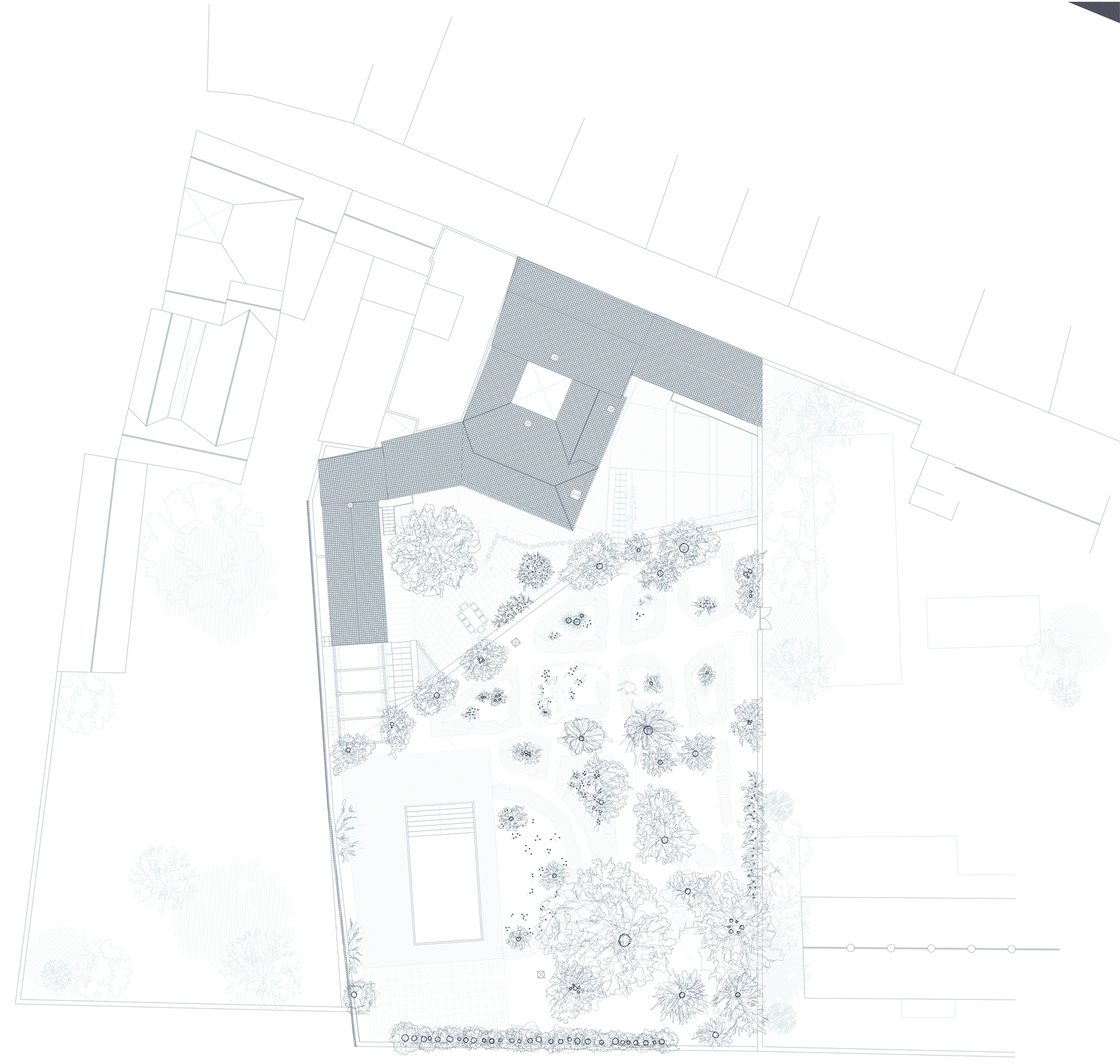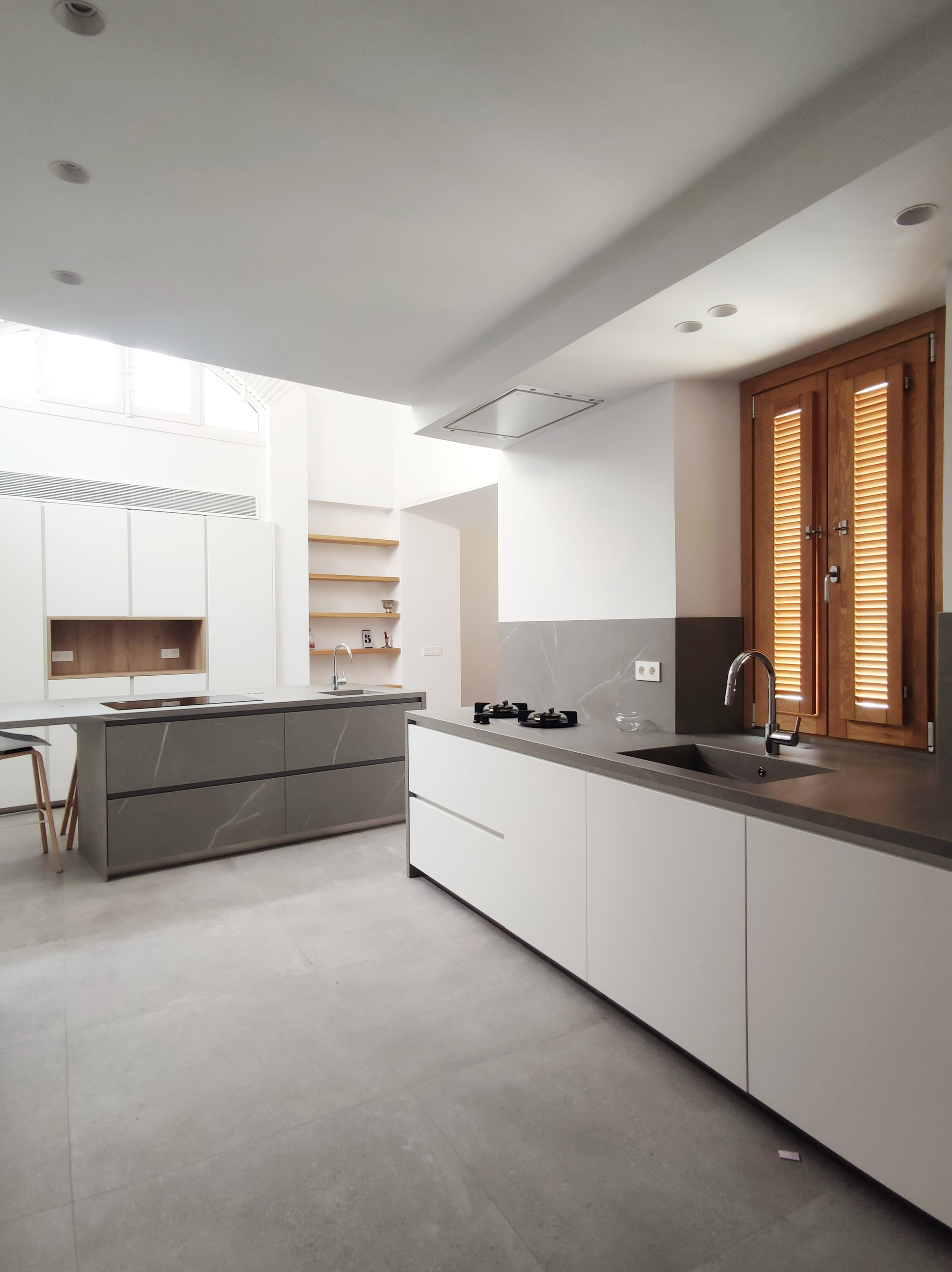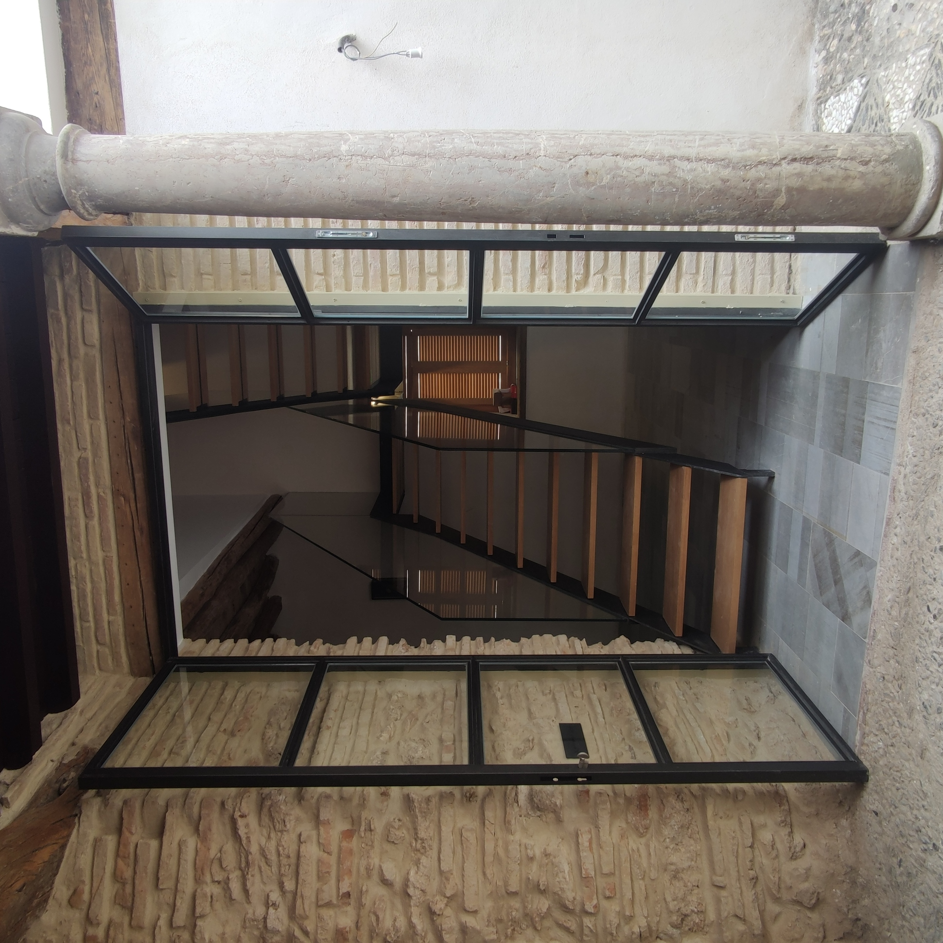 Esta reorganización interior se complementa trasladando la escalera existente en la fachada sur, ahora activada como zona central de la casa, al lateral este junto a la entrada desde el patio de ingreso de vehículos. De esta forma queda una única escalera de nuevo diseño conectando las tres plantas de la casa. Como mejora de accesibilidad integral se incorpora un ascensor en el lateral norte del patio. La intervención también añade nuevas conexiones entre los distintos niveles de la casa y de los patios existentes y el jardín que contiene la piscina, para ello se construyen dos nuevas escaleras exteriores.