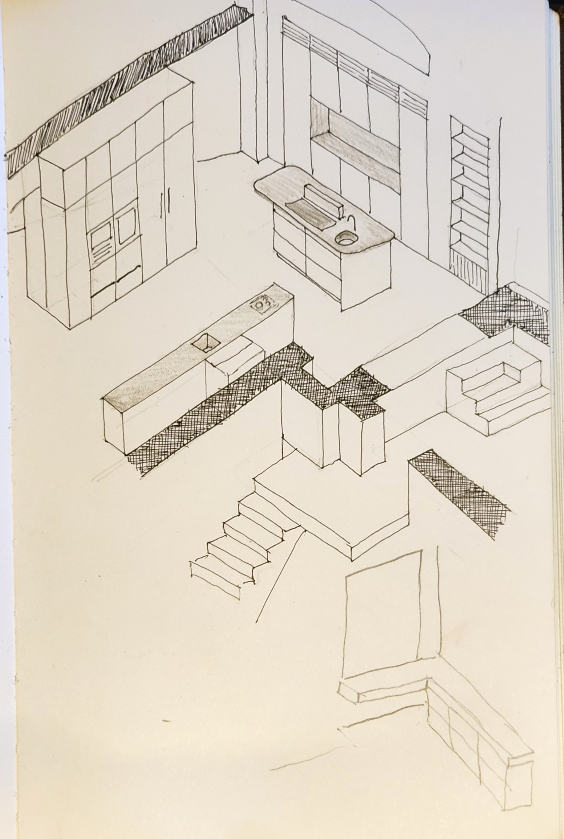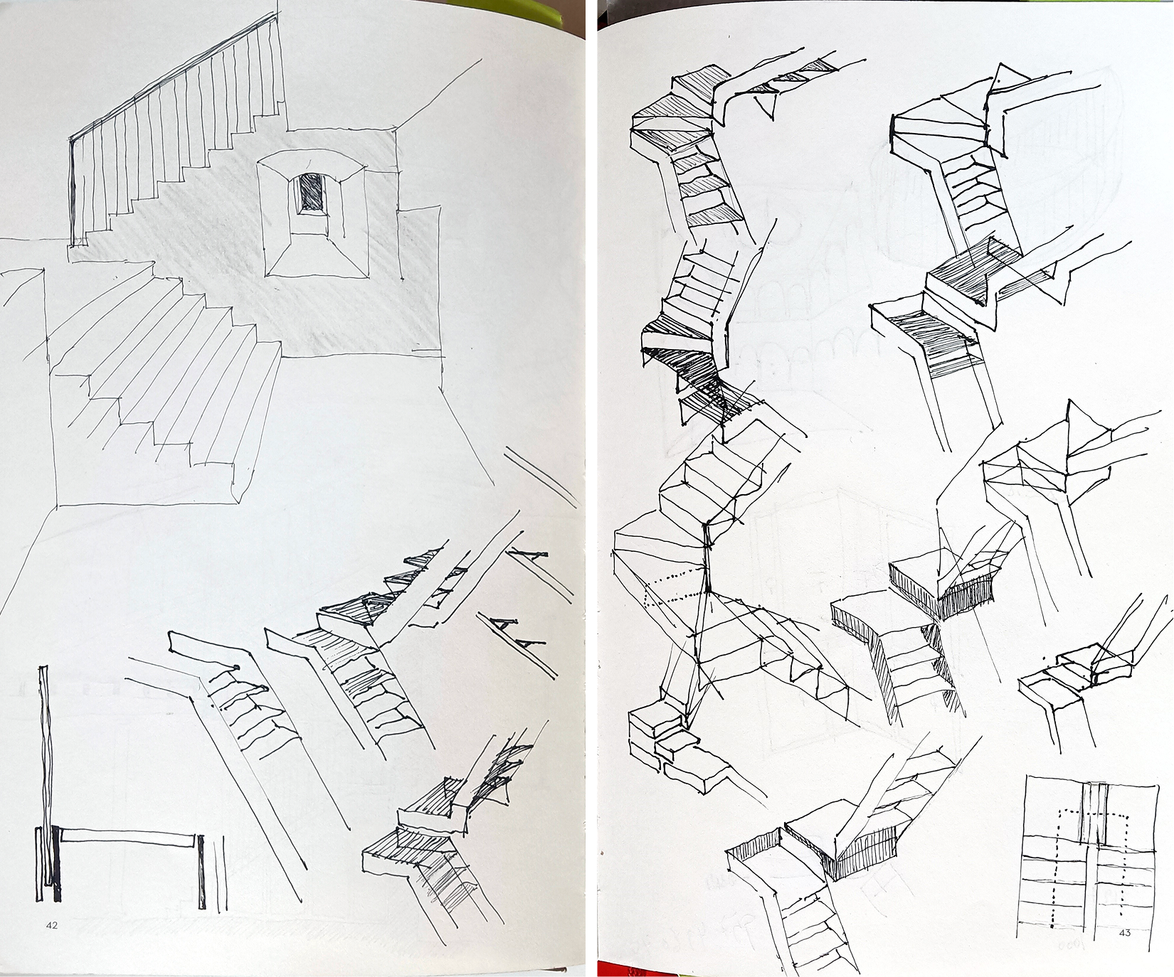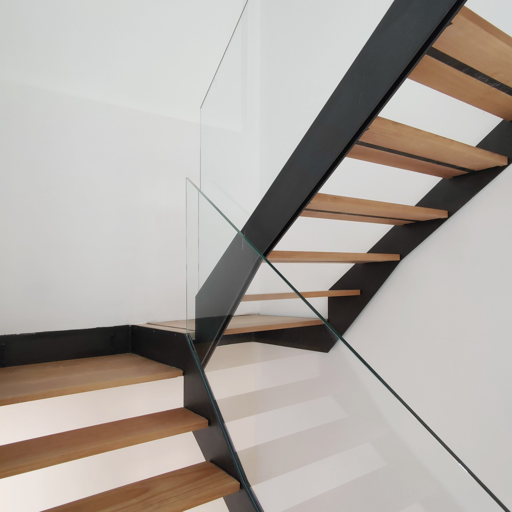 Esta reorganización interior se complementa trasladando la escalera existente en la fachada sur, ahora activada como zona central de la casa, al lateral este junto a la entrada desde el patio de ingreso de vehículos. De esta forma queda una única escalera de nuevo diseño conectando las tres plantas de la casa. Como mejora de accesibilidad integral se incorpora un ascensor en el lateral norte del patio. La intervención también añade nuevas conexiones entre los distintos niveles de la casa y de los patios existentes y el jardín que contiene la piscina, para ello se construyen dos nuevas escaleras exteriores.