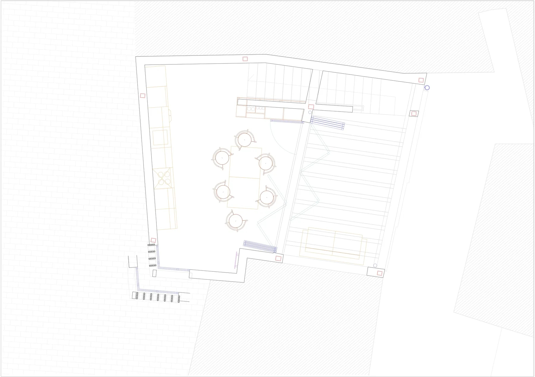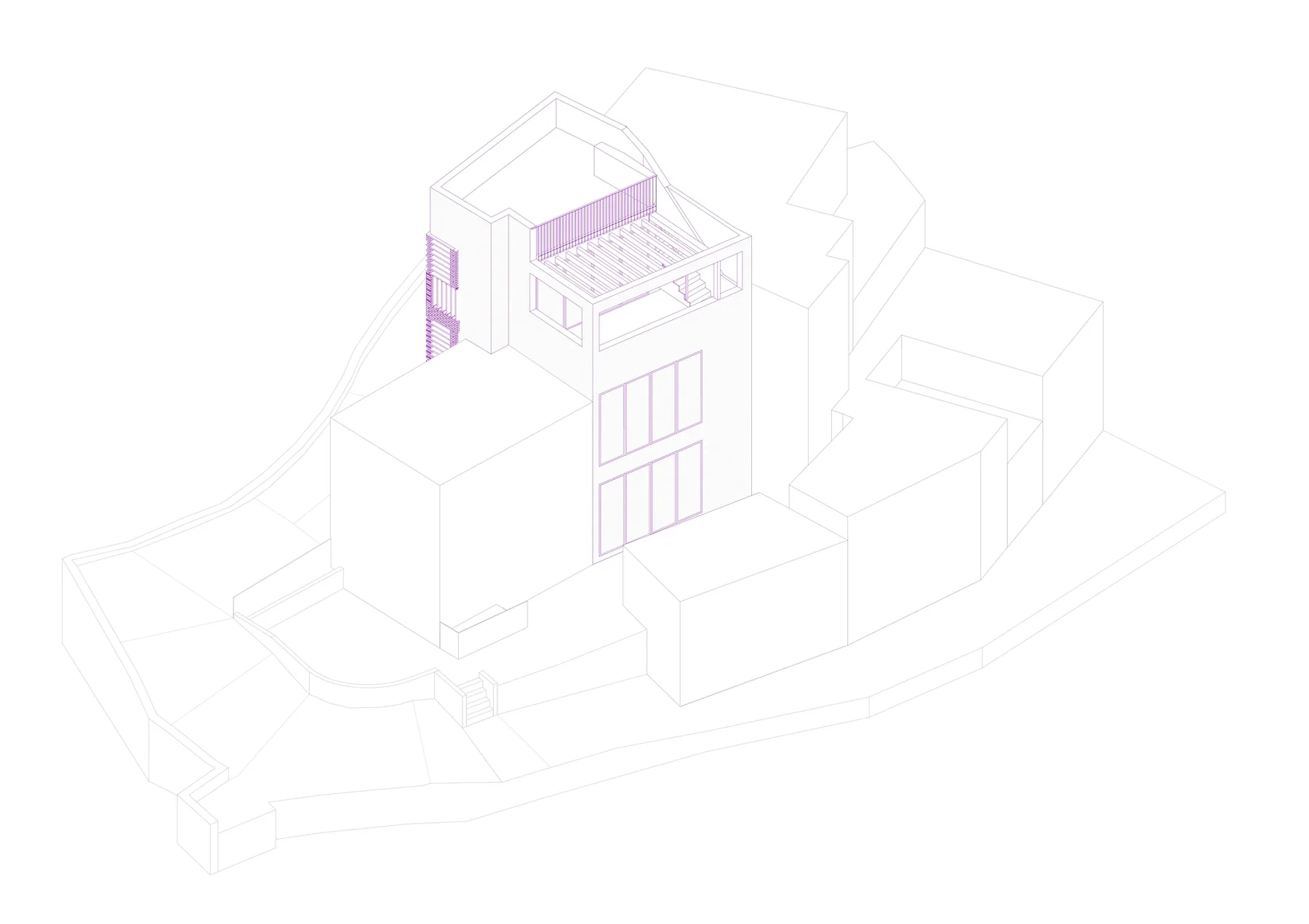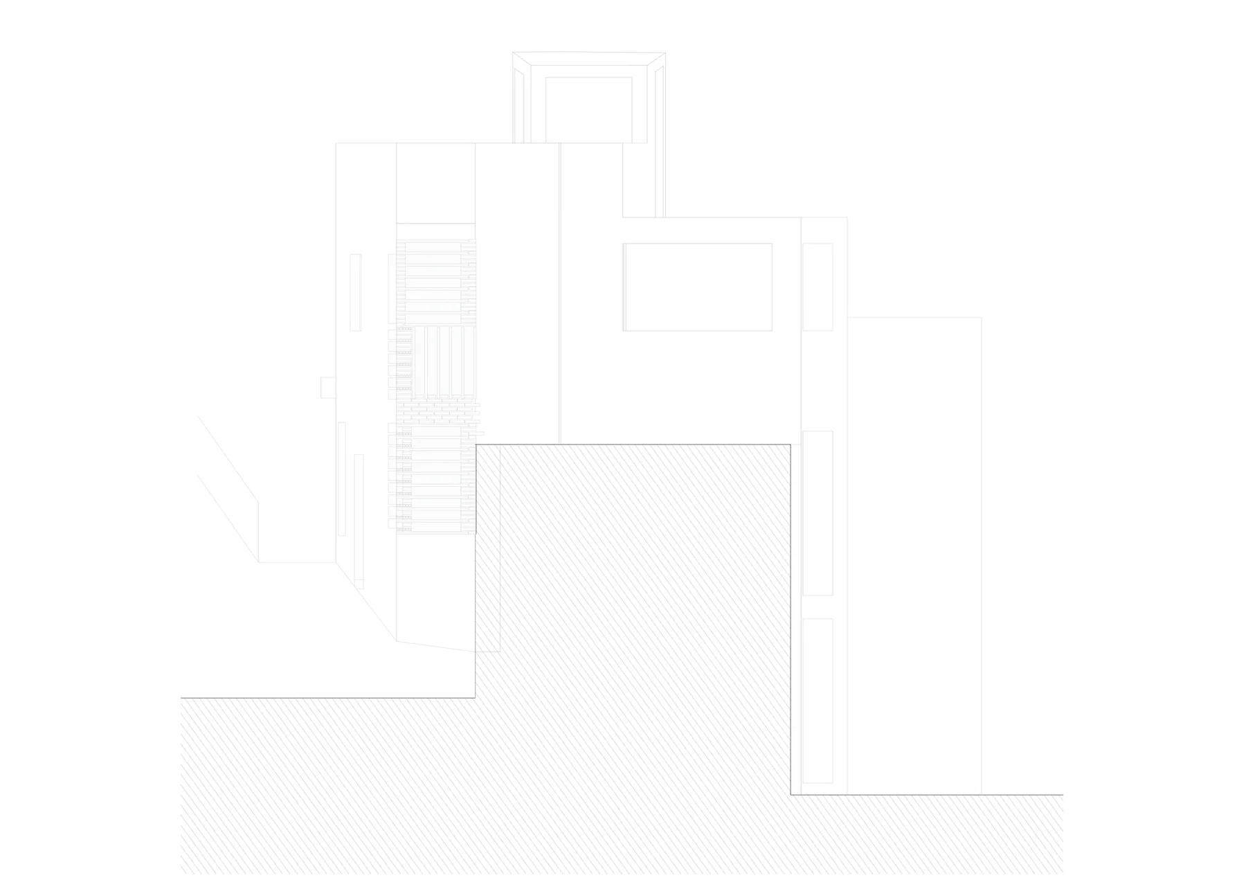 Dado el tamaño reducido de la parcela, menos de 50 m², se propone una casa que ocupe la totalidad del solar y agote la edificabilidad disponible. El proyecto, redactado en colaboración con el propietario y arquitecto Wolf Kherer, se organiza en un volumen único con dos fachadas completas orientadas al este y al oeste y una mirada norte y sur desde la azotea. La vivienda dispone de una única estancia principal en cada planta y una escalera de un solo tramo en la medianera norte, separada de las estancias mediante una batería de contenedores armario.