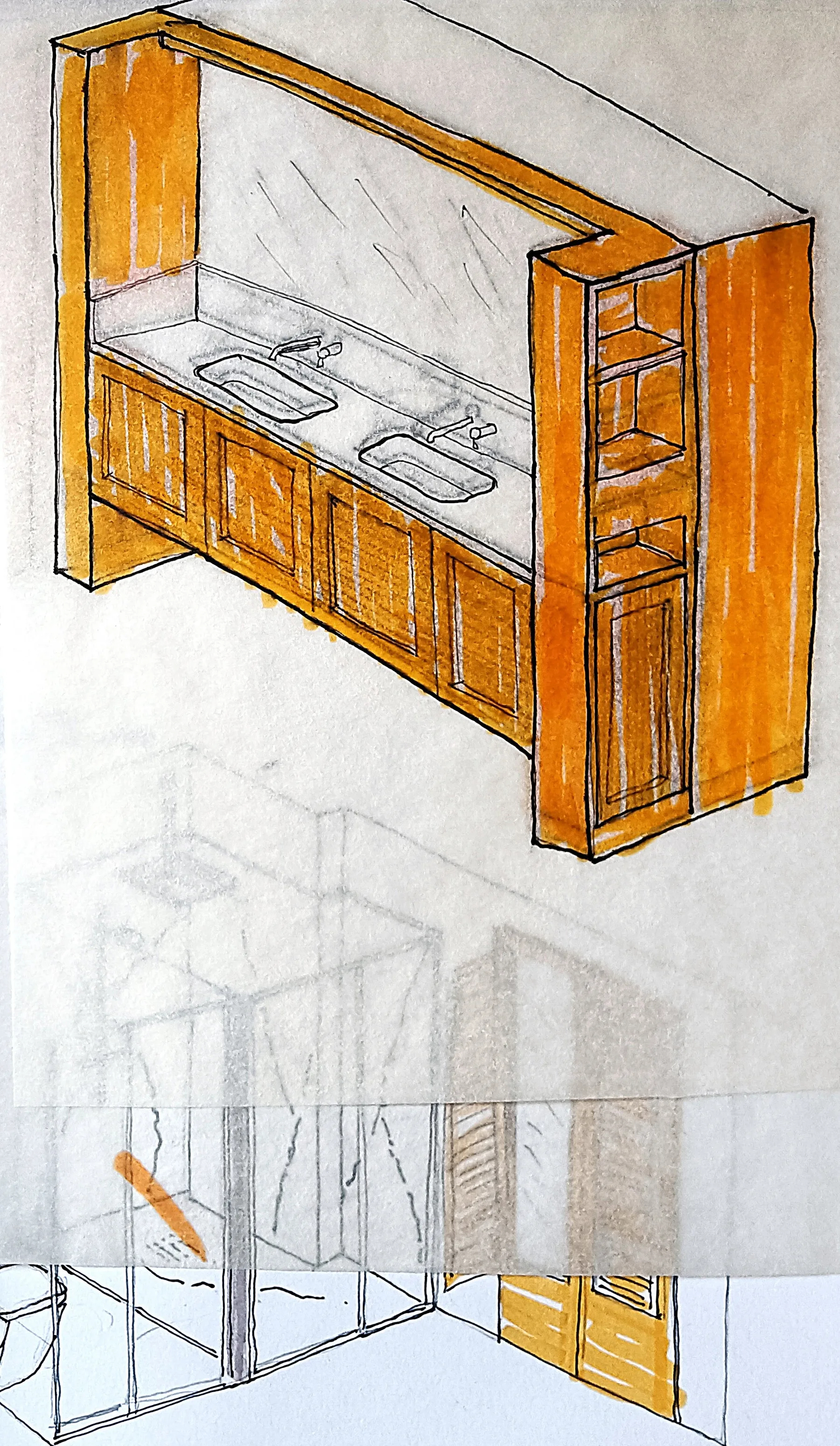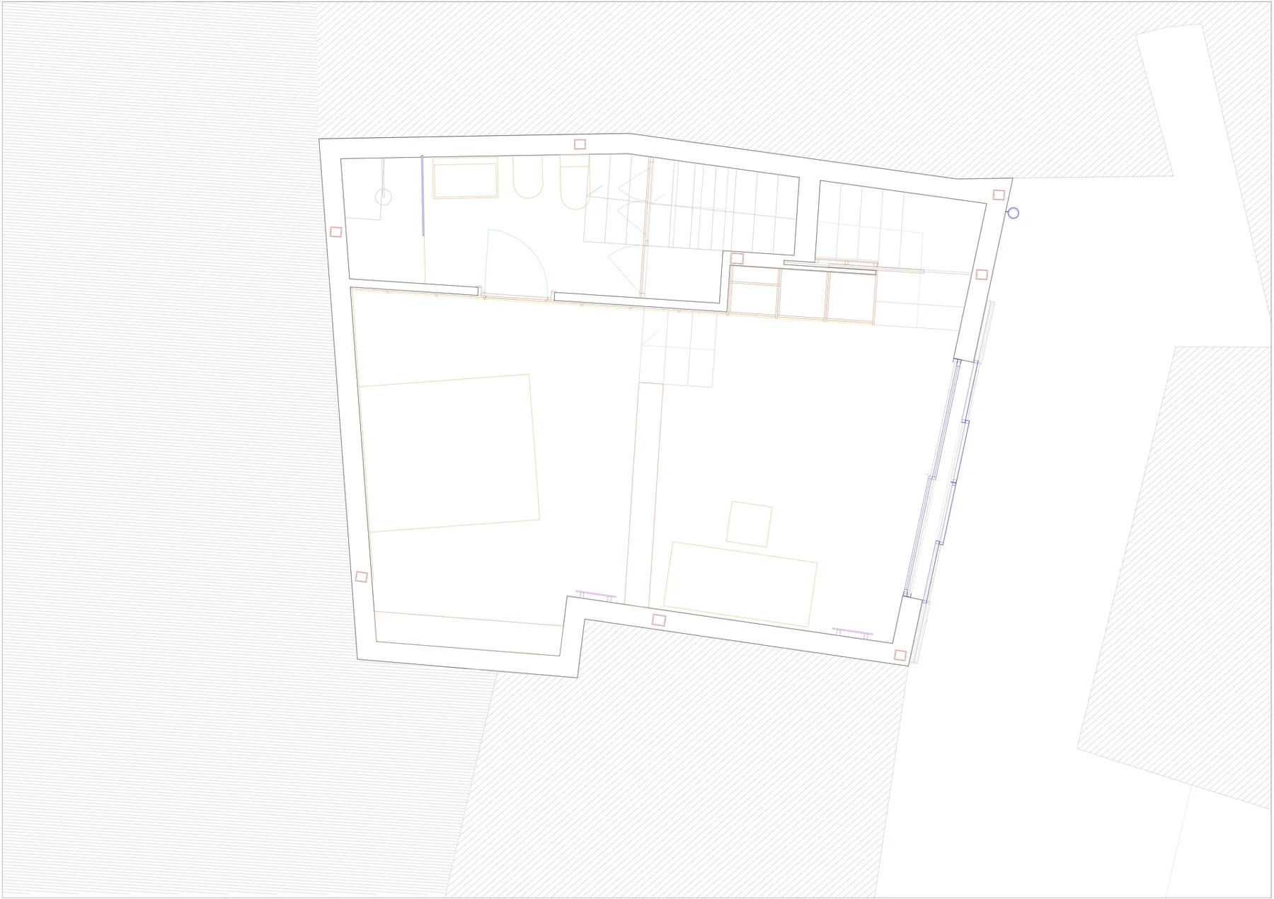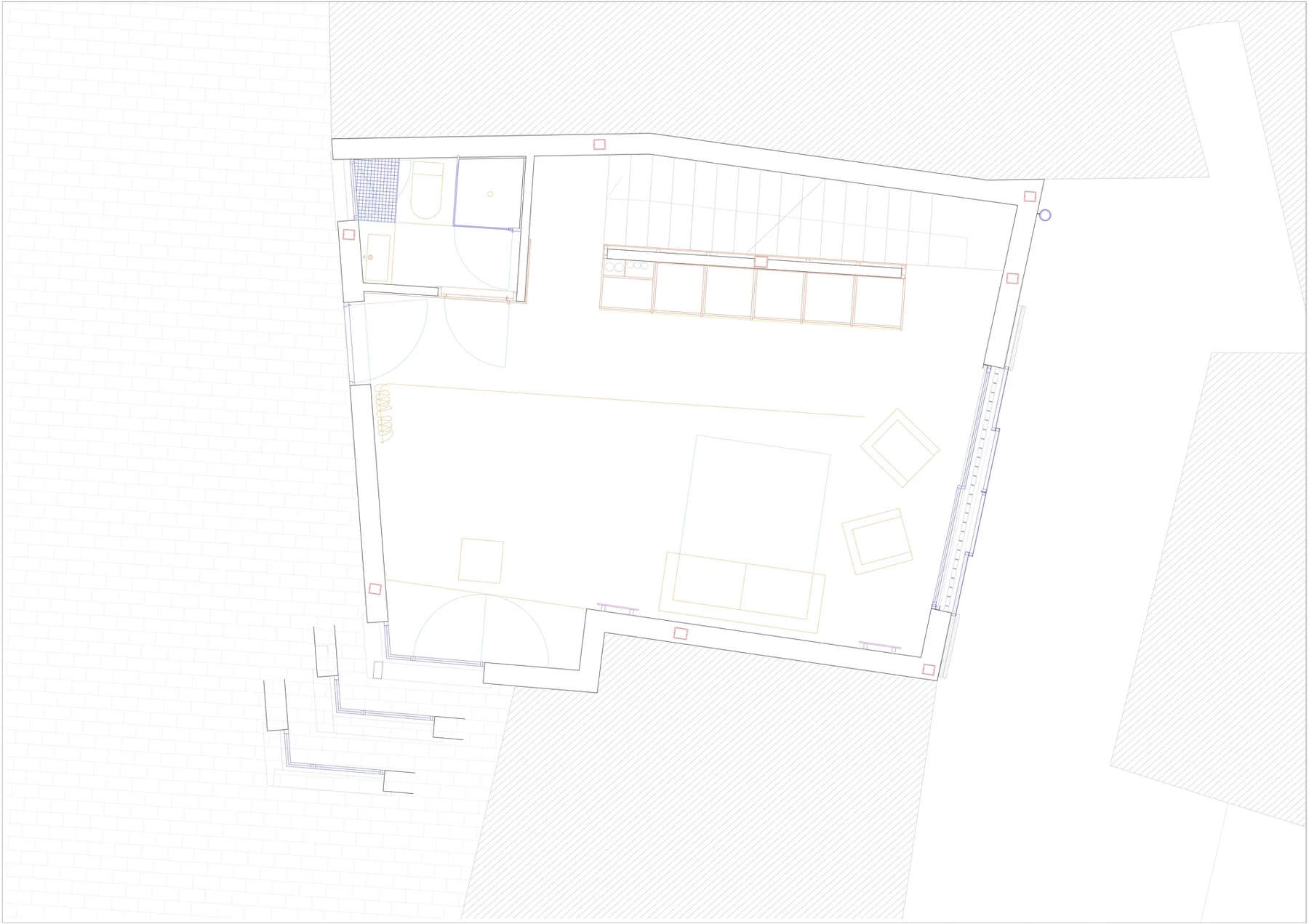 Dado el tamaño reducido de la parcela, menos de 50 m², se propone una casa que ocupe la totalidad del solar y agote la edificabilidad disponible. El proyecto, redactado en colaboración con el propietario y arquitecto Wolf Kherer, se organiza en un volumen único con dos fachadas completas orientadas al este y al oeste y una mirada norte y sur desde la azotea. La vivienda dispone de una única estancia principal en cada planta y una escalera de un solo tramo en la medianera norte, separada de las estancias mediante una batería de contenedores armario.