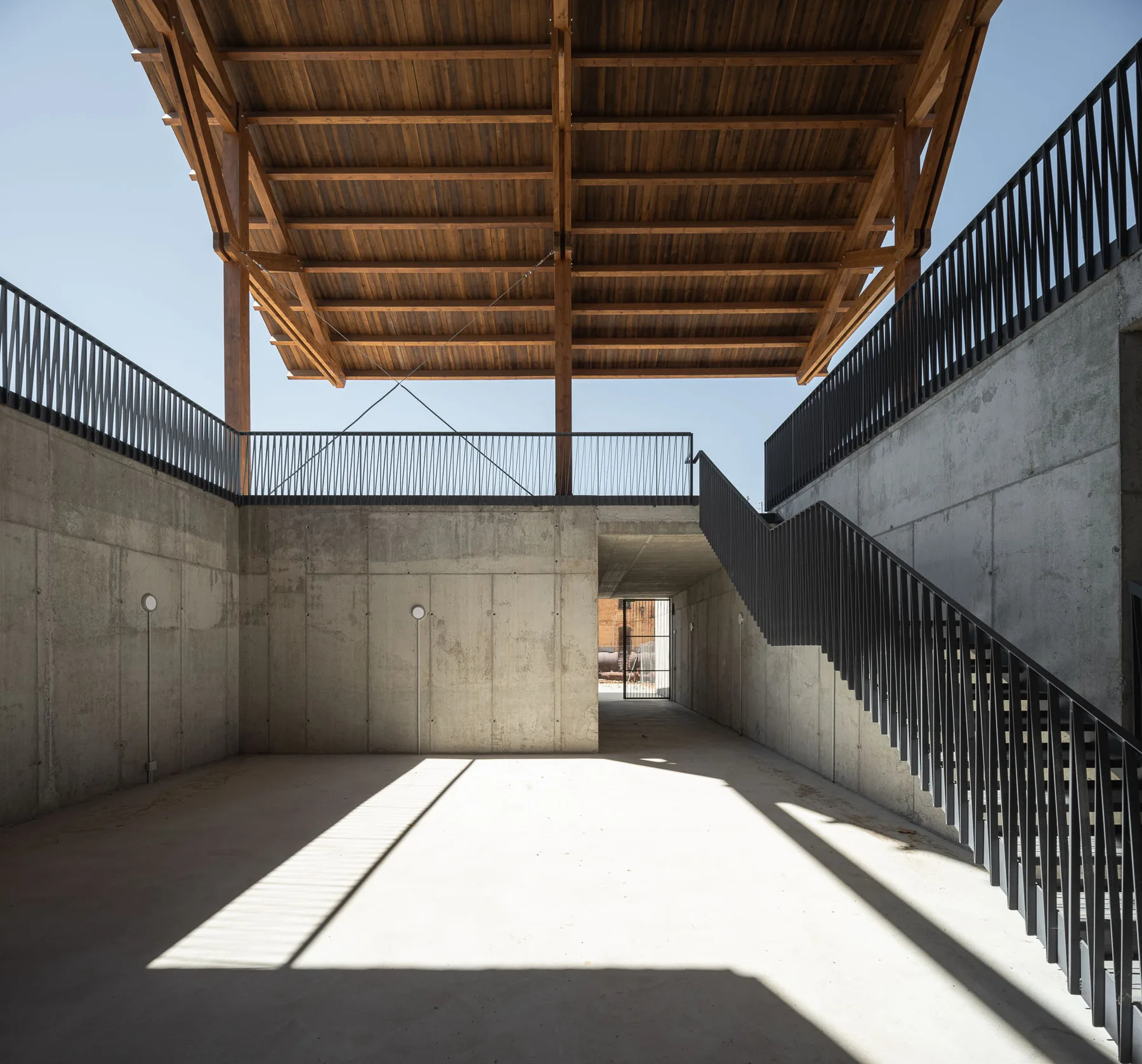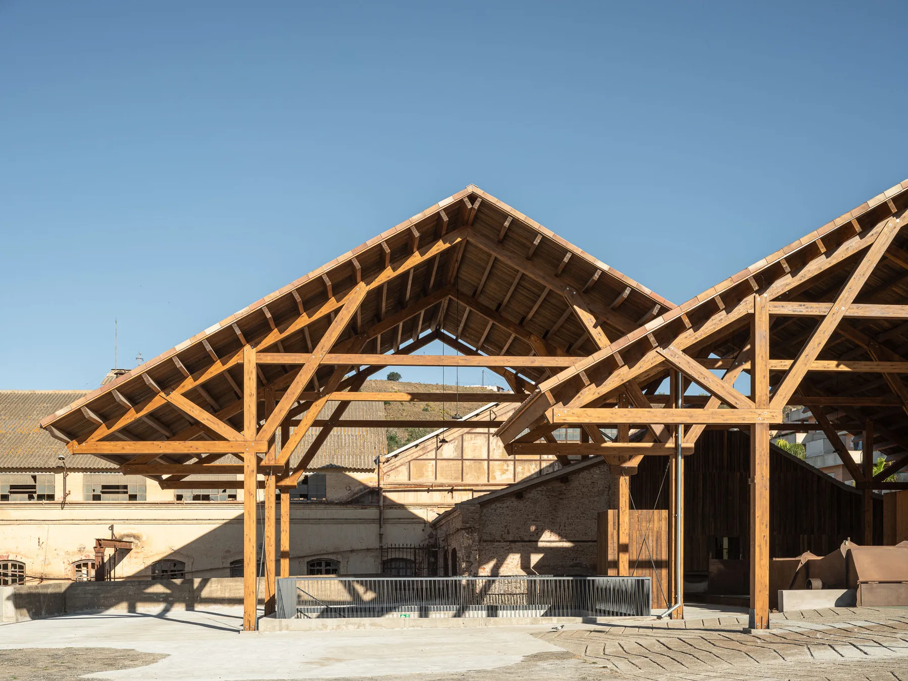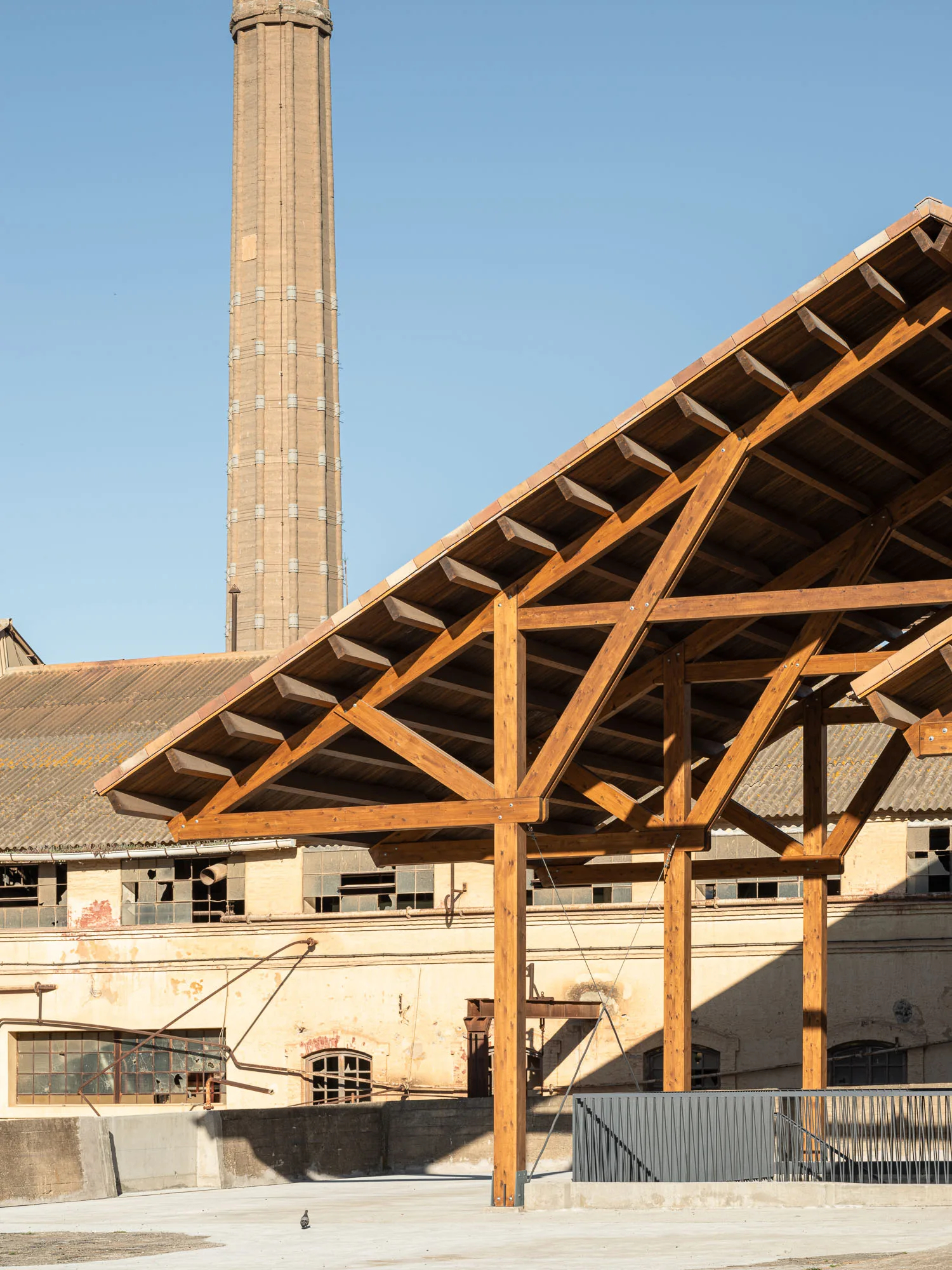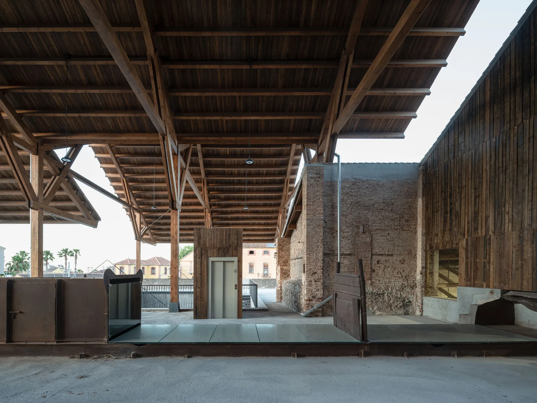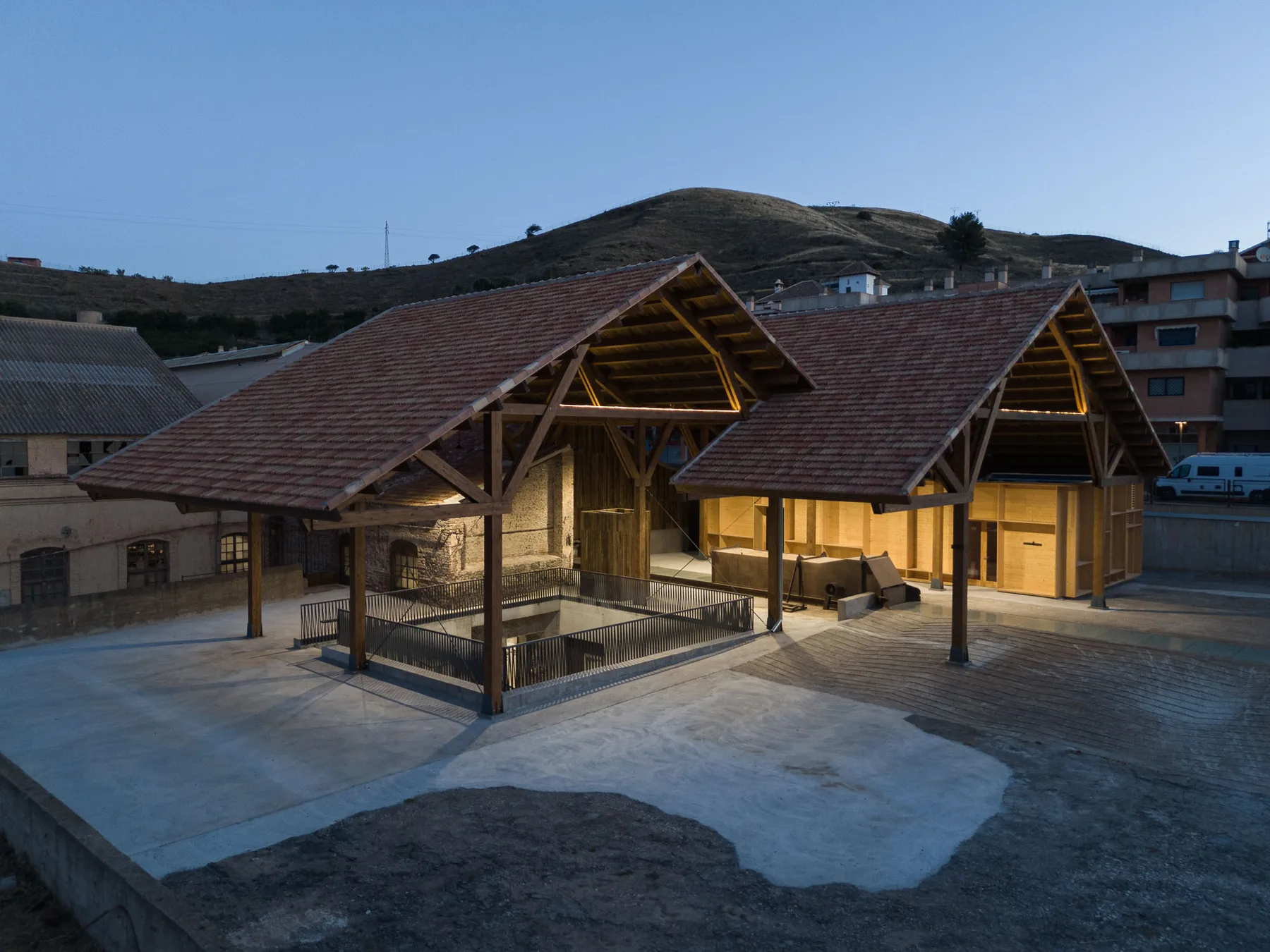 De forma complementaria se construye una pérgola de sombra, una estructura porticada a dos aguas de madera laminada inspirada en el sistema de soportes y cerchas de la nave cortadora. Bajo esta pérgola se coloca un módulo prefabricado con control de accesos, sala multiusos audiovisual, aseos y cuarto técnico. Las fachadas de este pabellón se diseñan como estanterías y paneles expositivos con información del Museo, materiales documentales y fotografías históricas. Un elevador conecta los dos niveles principales facilitando la accesibilidad sin alterar las características formales del BIC existente.