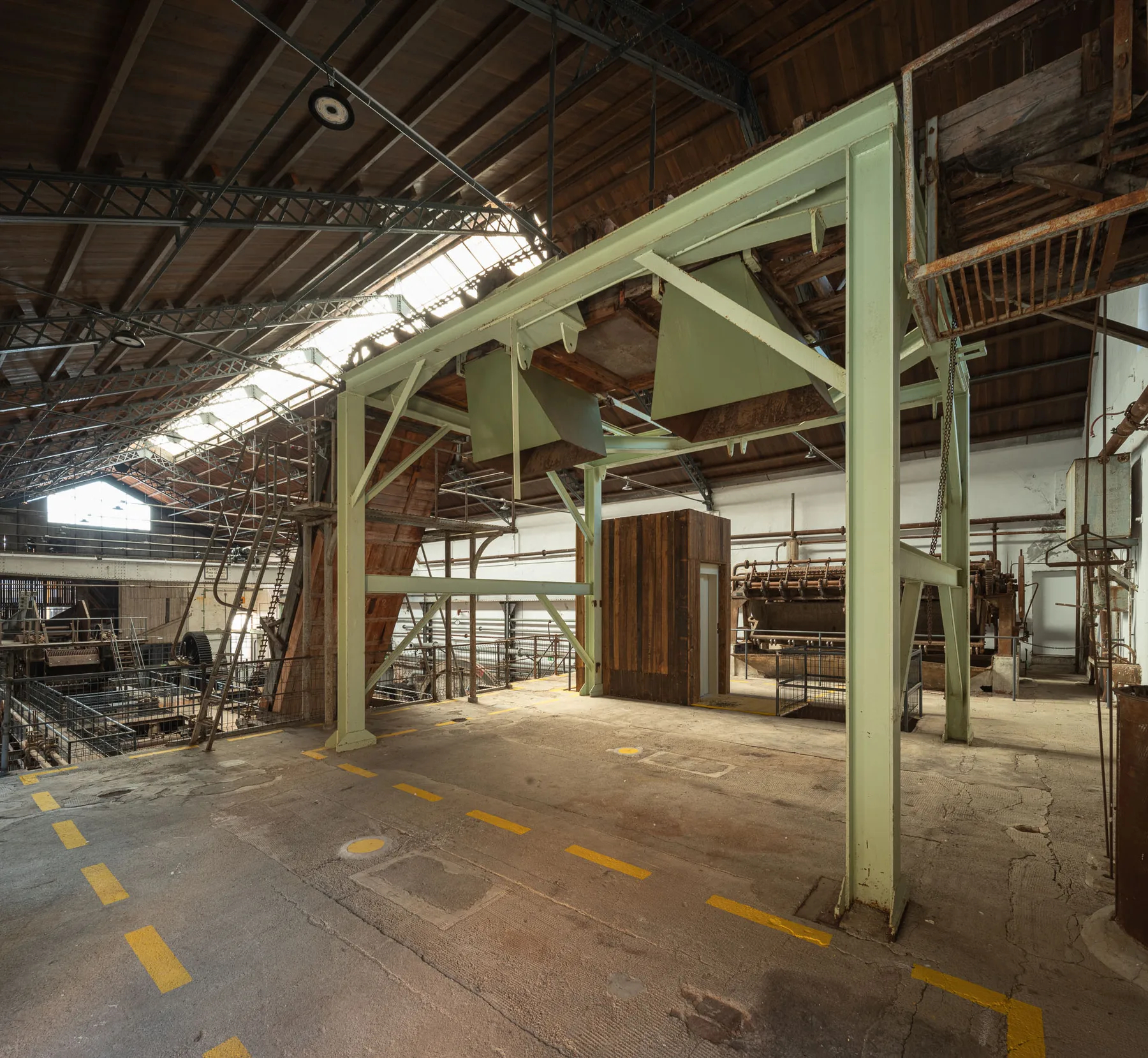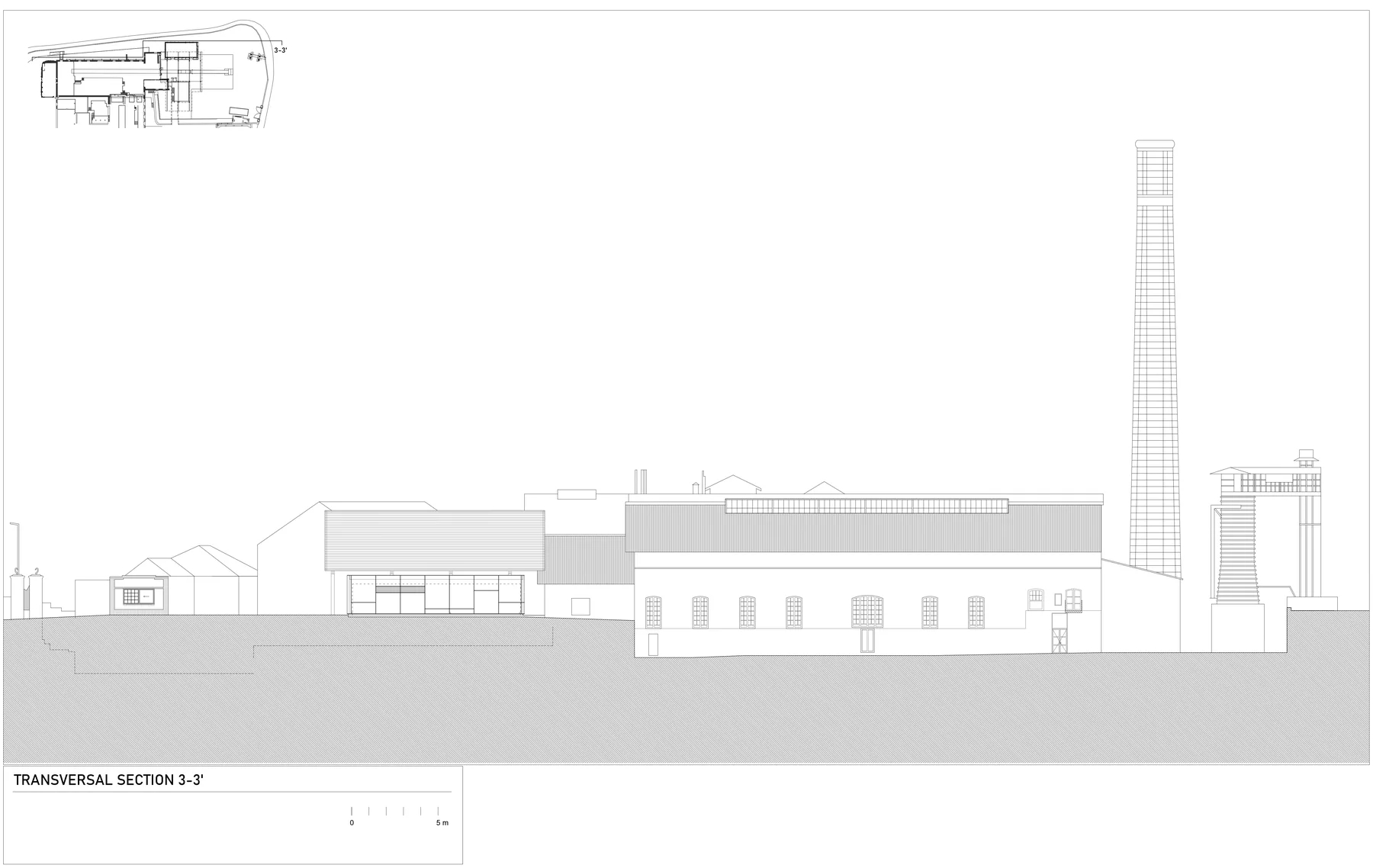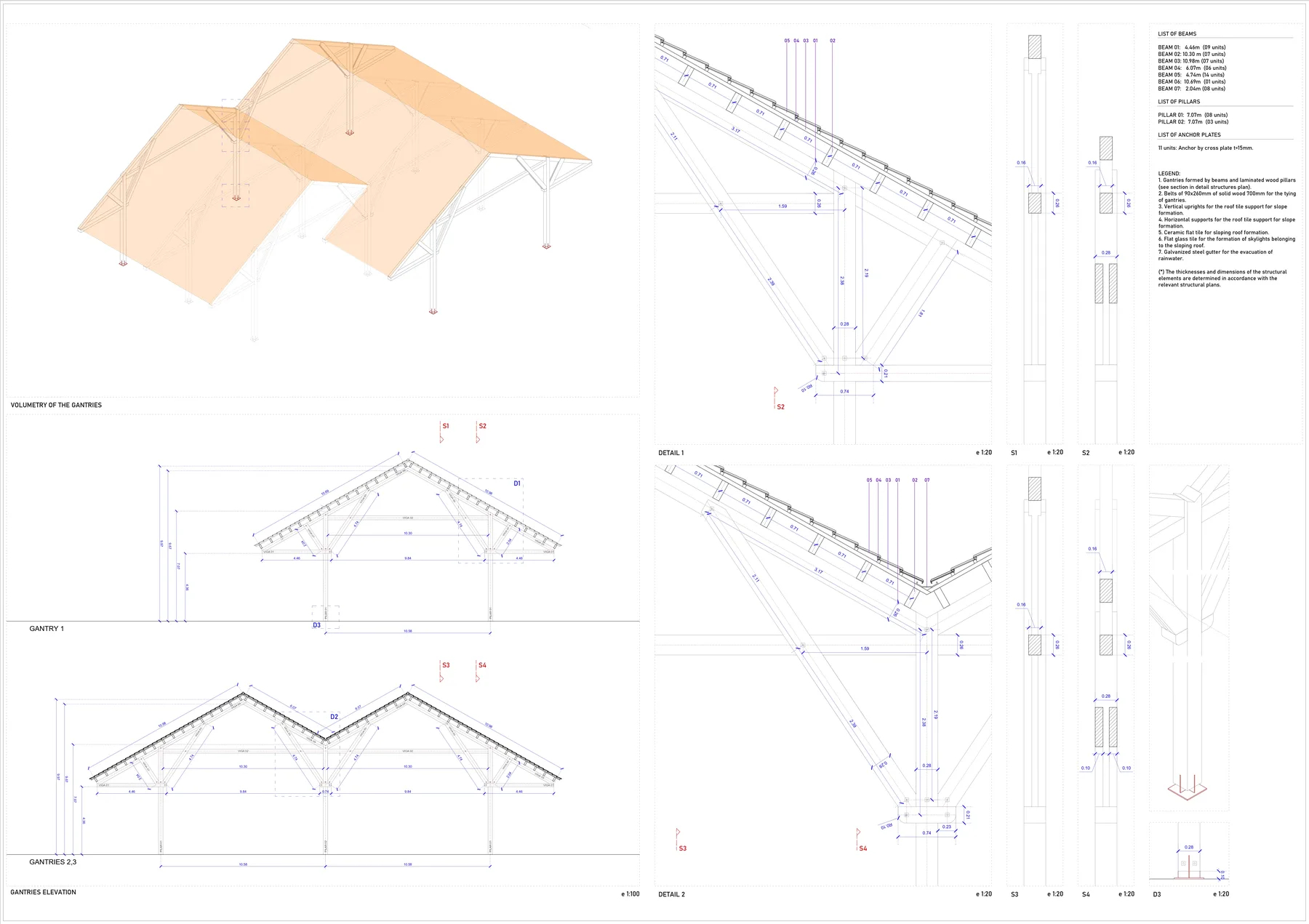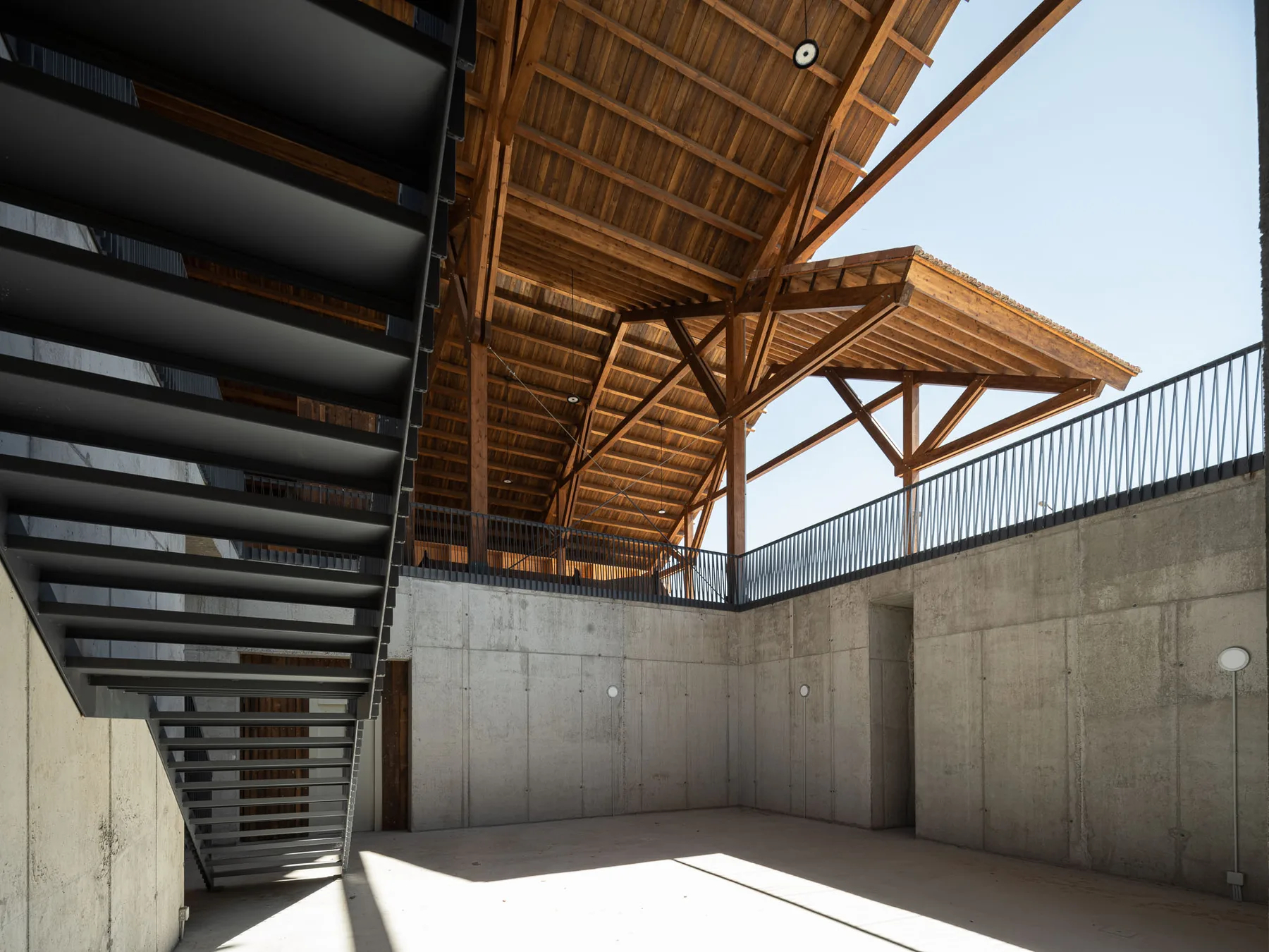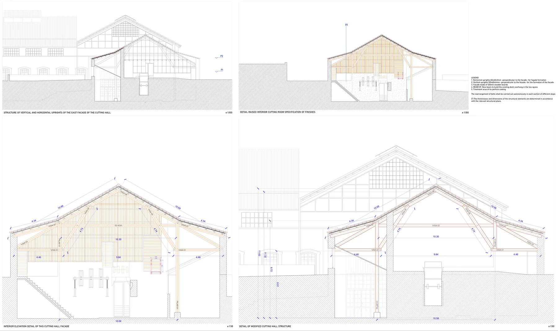 De forma complementaria se construye una pérgola de sombra, una estructura porticada a dos aguas de madera laminada inspirada en el sistema de soportes y cerchas de la nave cortadora. Bajo esta pérgola se coloca un módulo prefabricado con control de accesos, sala multiusos audiovisual, aseos y cuarto técnico. Las fachadas de este pabellón se diseñan como estanterías y paneles expositivos con información del Museo, materiales documentales y fotografías históricas. Un elevador conecta los dos niveles principales facilitando la accesibilidad sin alterar las características formales del BIC existente.