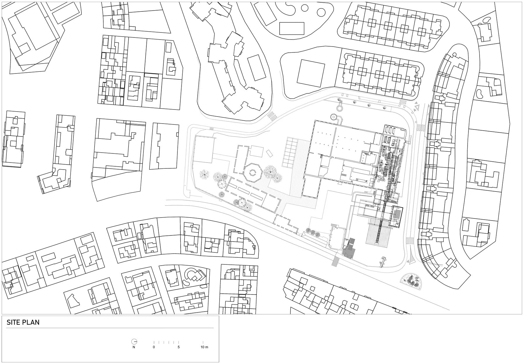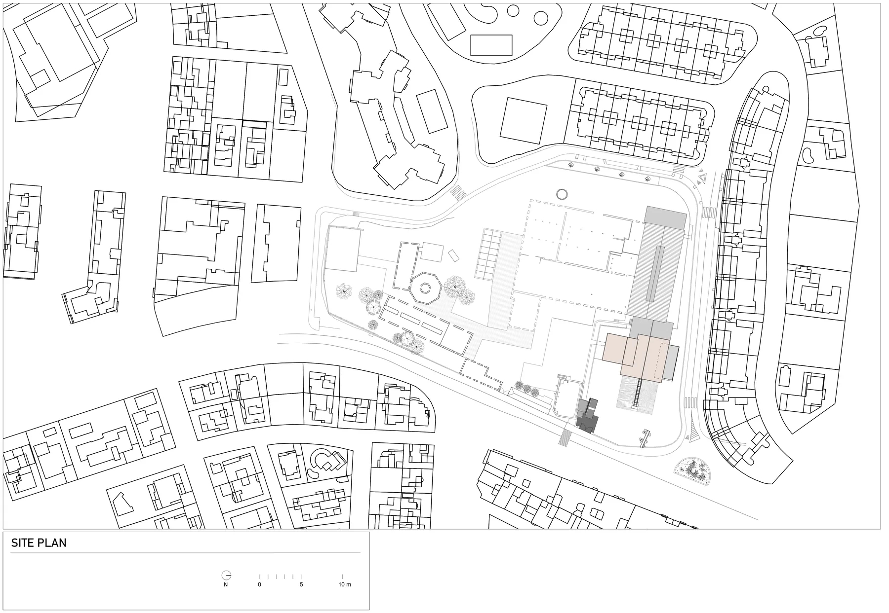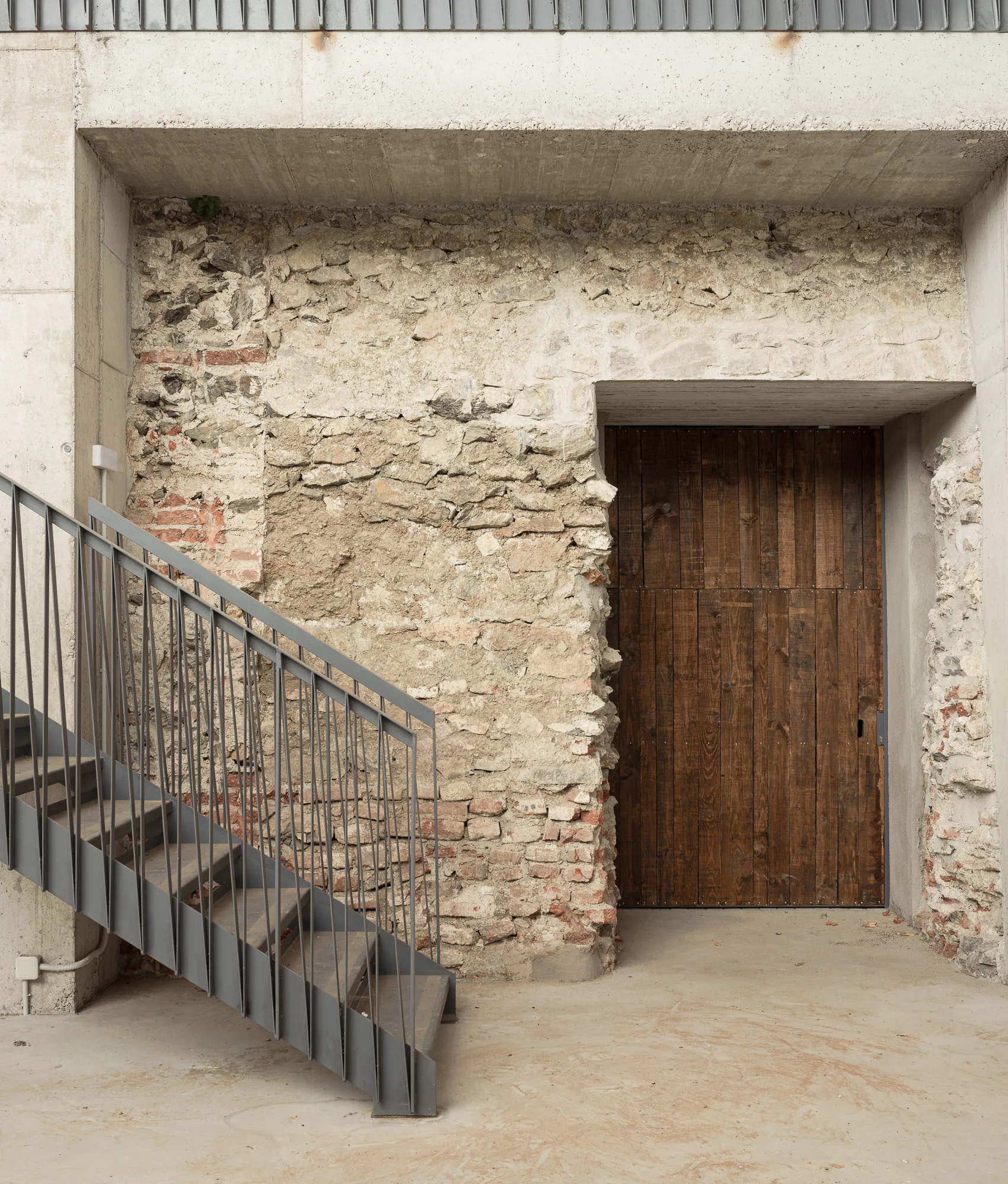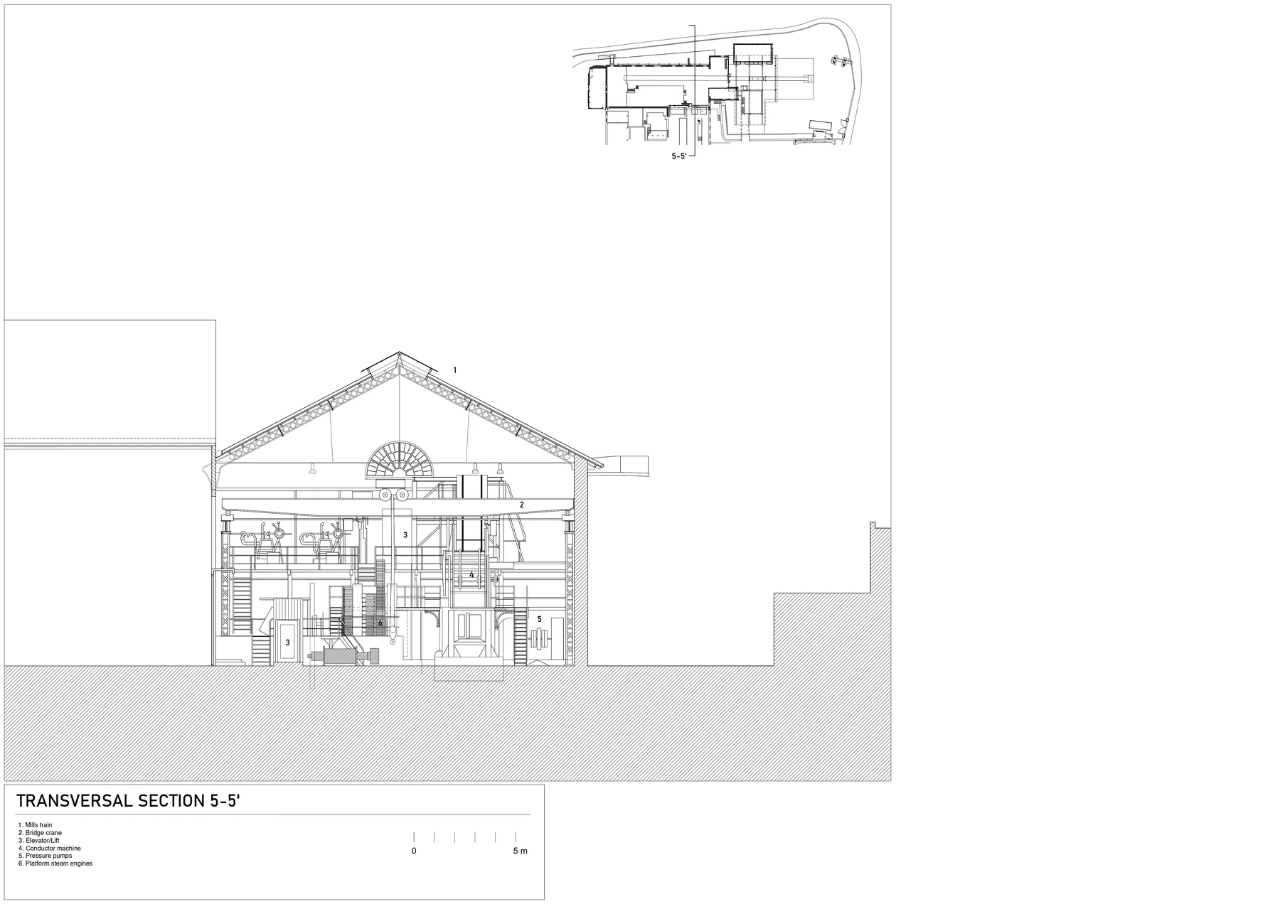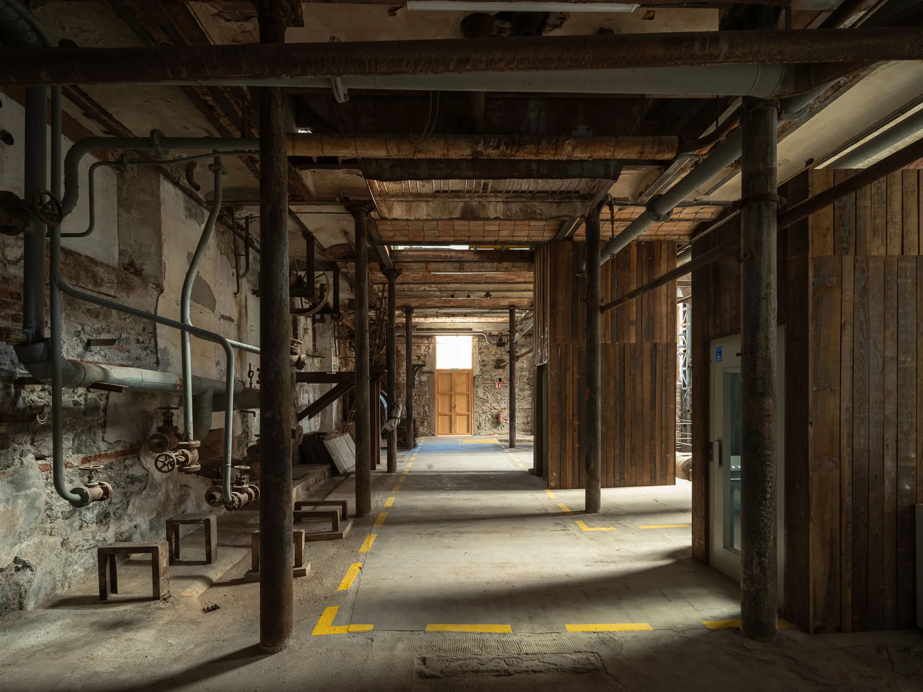 De forma complementaria se construye una pérgola de sombra, una estructura porticada a dos aguas de madera laminada inspirada en el sistema de soportes y cerchas de la nave cortadora. Bajo esta pérgola se coloca un módulo prefabricado con control de accesos, sala multiusos audiovisual, aseos y cuarto técnico. Las fachadas de este pabellón se diseñan como estanterías y paneles expositivos con información del Museo, materiales documentales y fotografías históricas. Un elevador conecta los dos niveles principales facilitando la accesibilidad sin alterar las características formales del BIC existente.