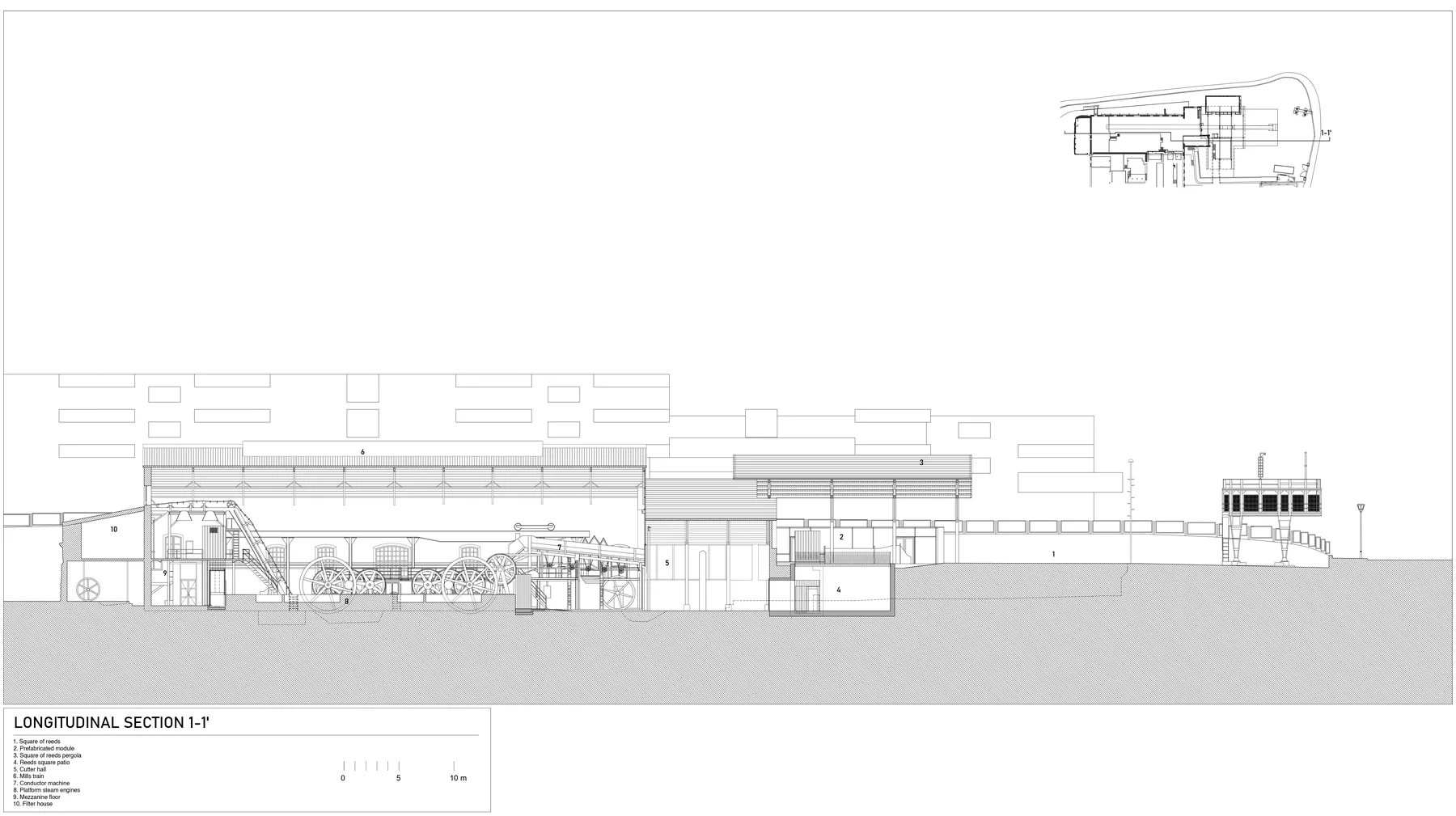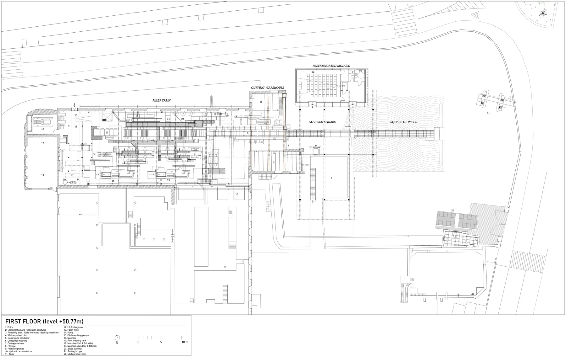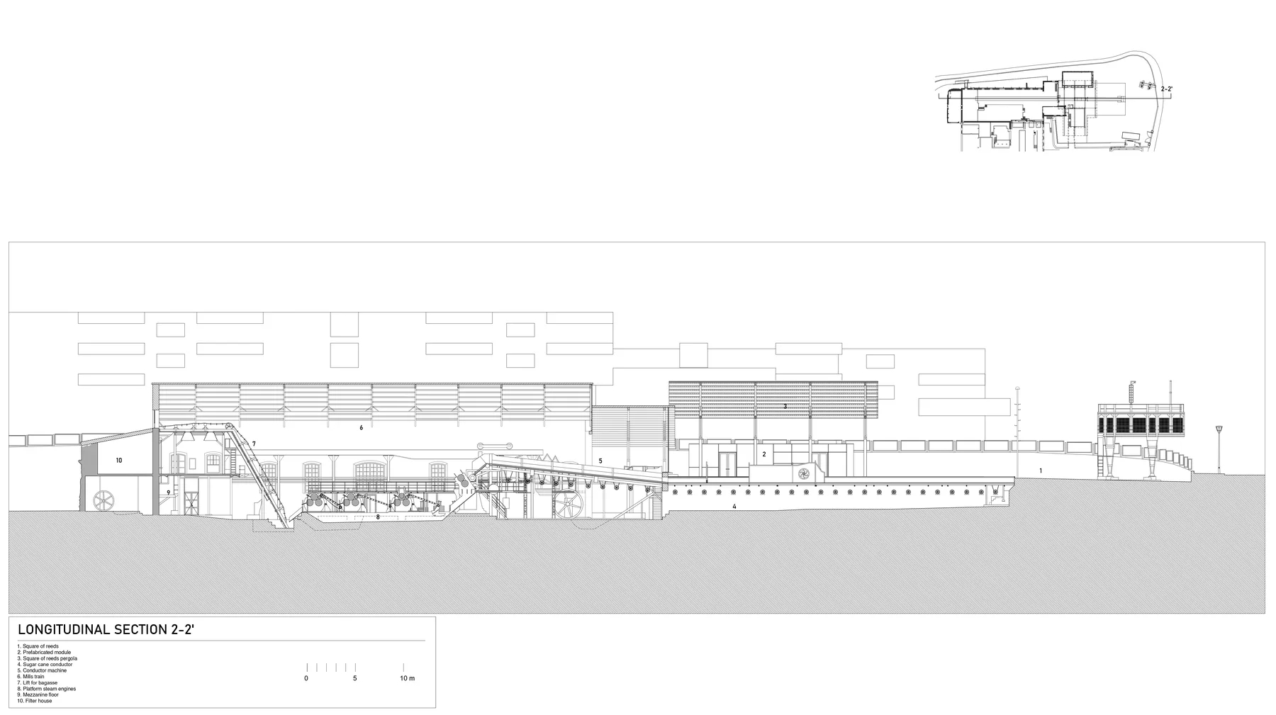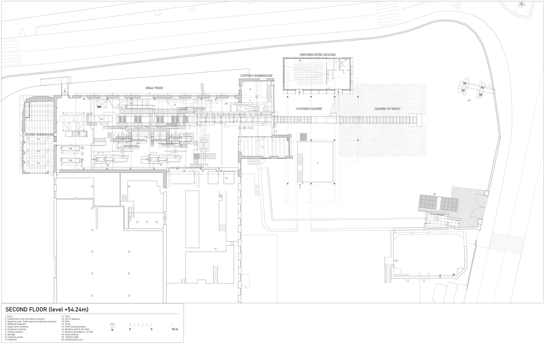La segunda iniciativa incluye un área de acceso en la fachada este de la Nave Cortadora de Cañas, con un pabellón prefabricado de gestión y recepción, y un patio de tipo inglés que aloja un área de trabajo técnico para la recuperación y clasificación de enseres y maquinaria. Se ha construido un pasaje, una galería expositiva de conexión entre los espacios, a través de la nave de taller mecánico existente.