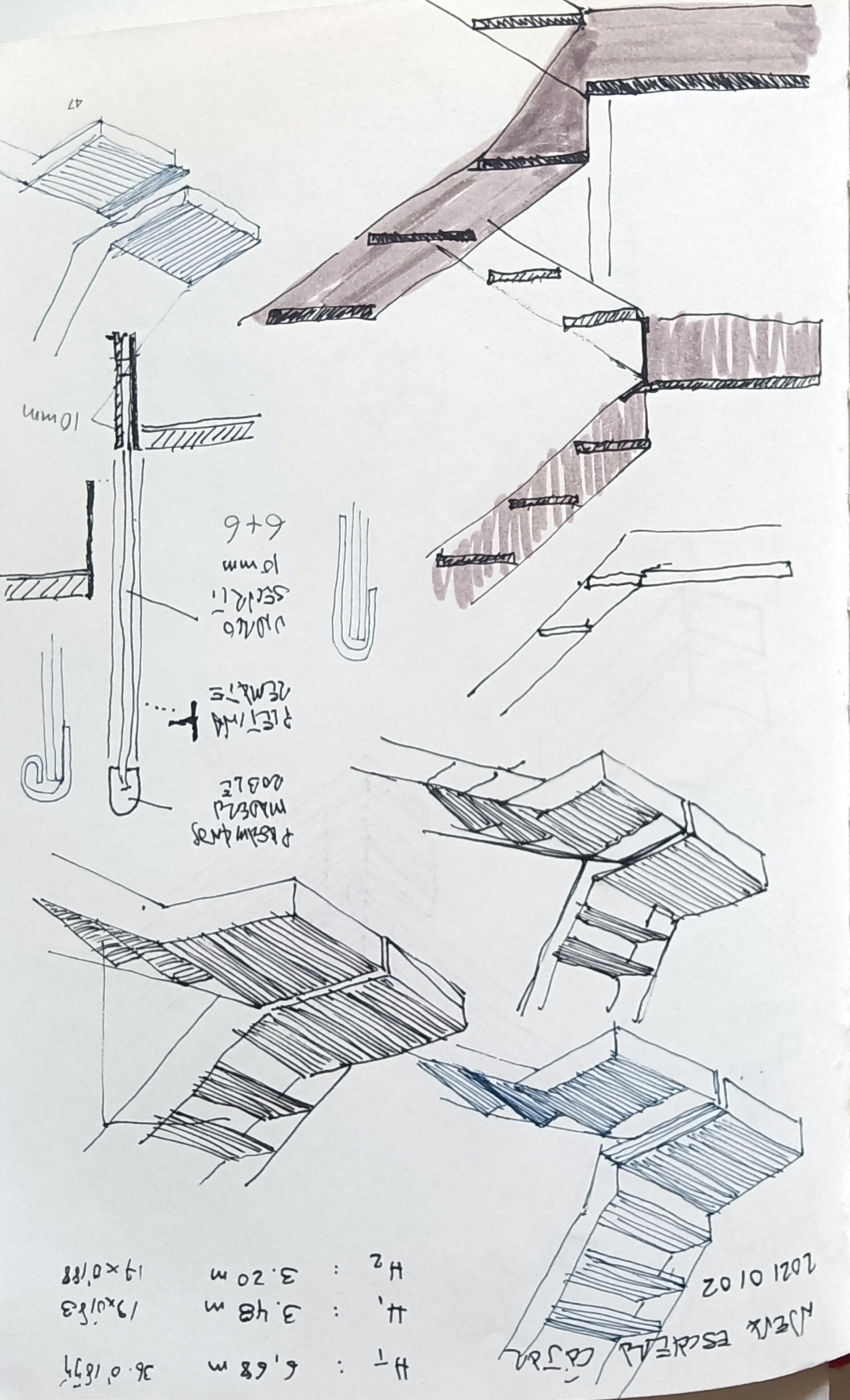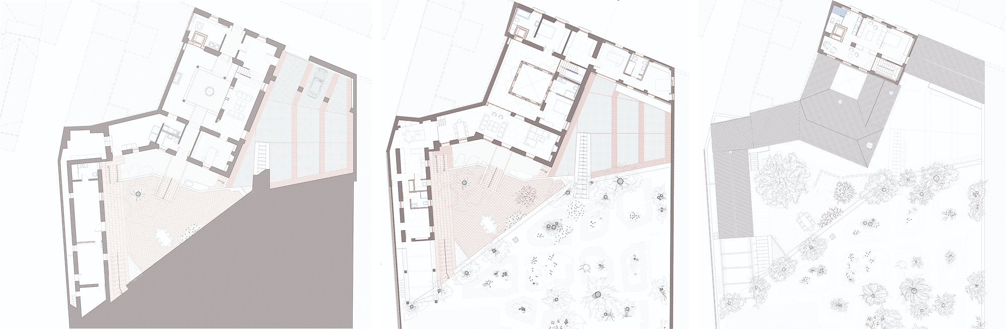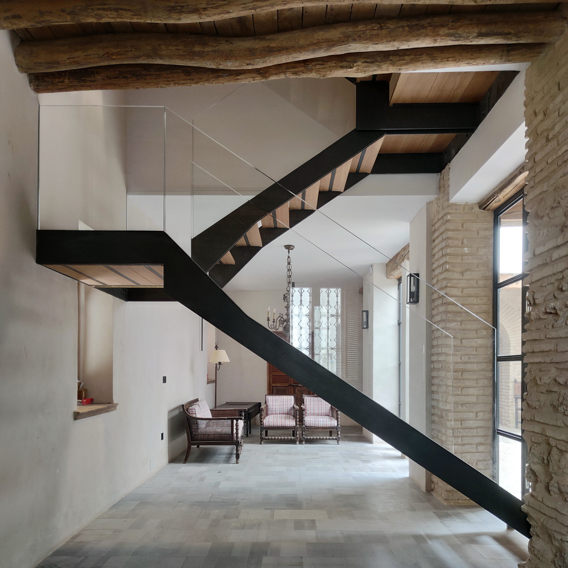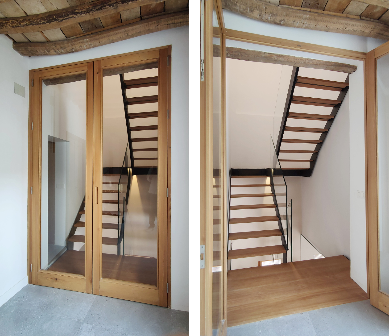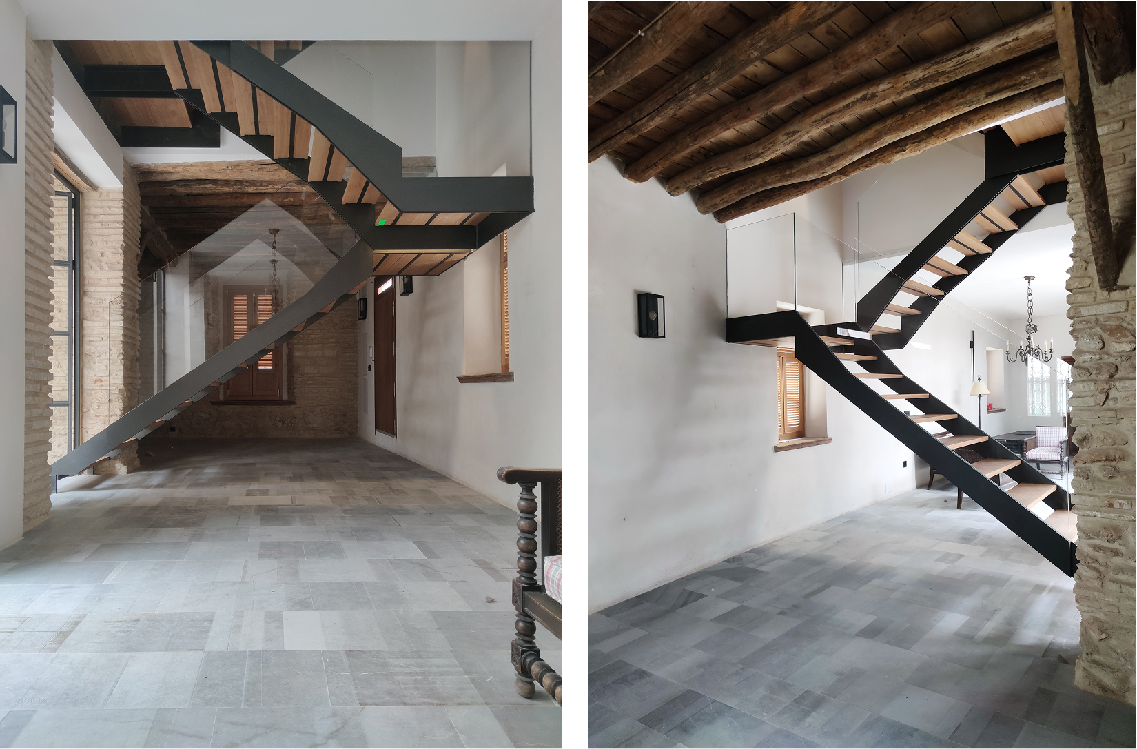 Esta reorganización interior se complementa trasladando la escalera existente en la fachada sur, ahora activada como zona central de la casa, al lateral este junto a la entrada desde el patio de ingreso de vehículos. De esta forma queda una única escalera de nuevo diseño conectando las tres plantas de la casa. Como mejora de accesibilidad integral se incorpora un ascensor en el lateral norte del patio. La intervención también añade nuevas conexiones entre los distintos niveles de la casa y de los patios existentes y el jardín que contiene la piscina, para ello se construyen dos nuevas escaleras exteriores.
