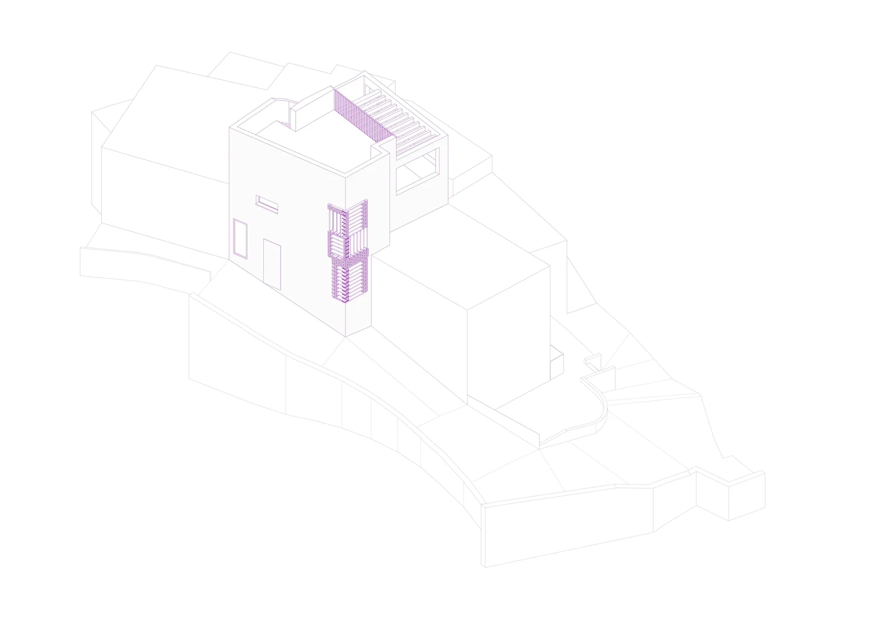 Debido al desnivel del solar, la vivienda tiene dos accesos a diferente cota desde cada una de las calles colindantes. En el nivel inferior se dispone un dormitorio con baño y una pequeña zona de estar orientada al este. En la planta intermedia, con acceso desde la calle Real, se encuentra otro dormitorio y sala de trabajo con aseo. En la planta segunda se sitúa la cocina con una terraza con pérgola orientada al este, y desde esta una escalera da acceso a la azotea, acondicionada con cubierta a un agua orientada al sur para la producción termosolar.