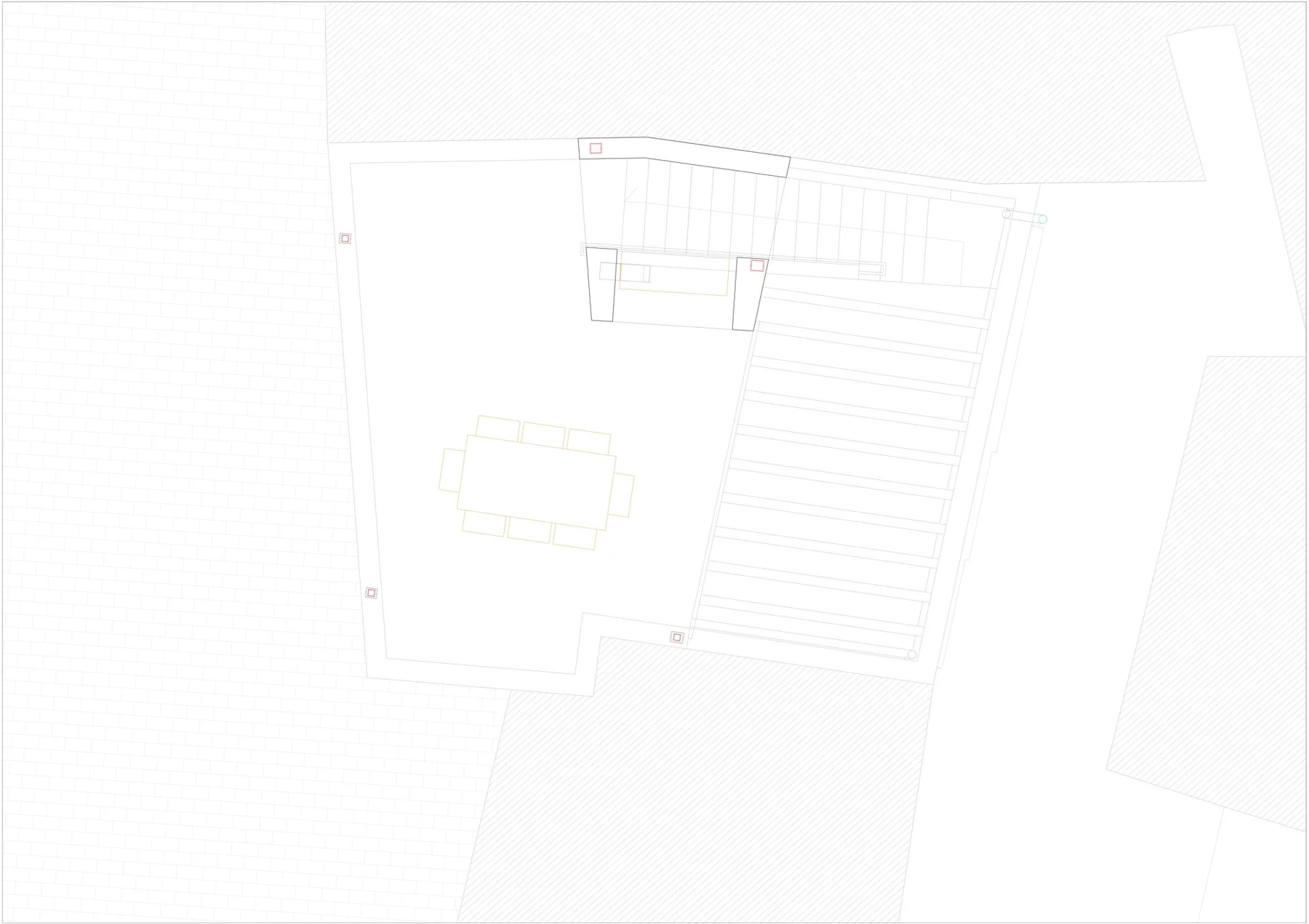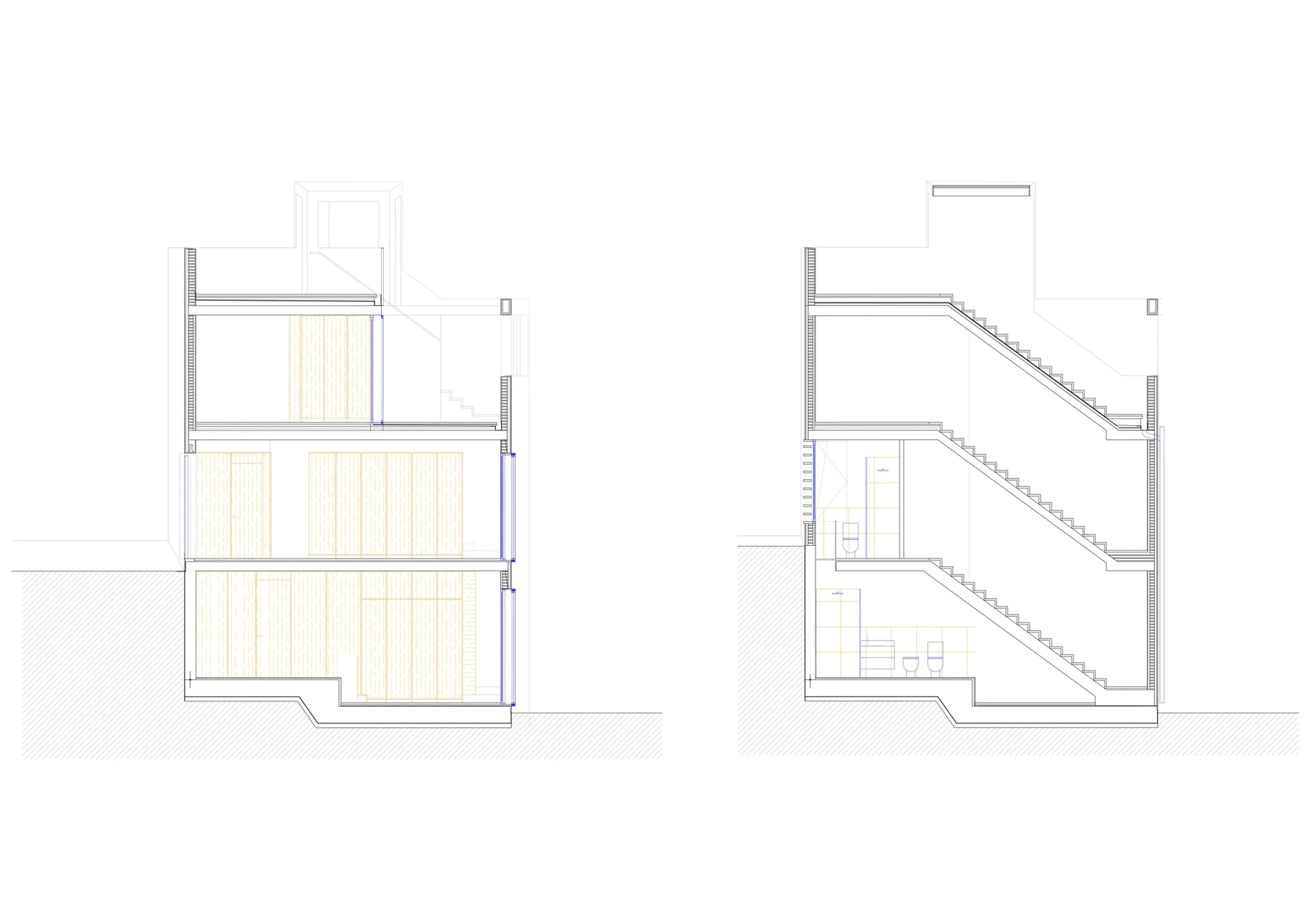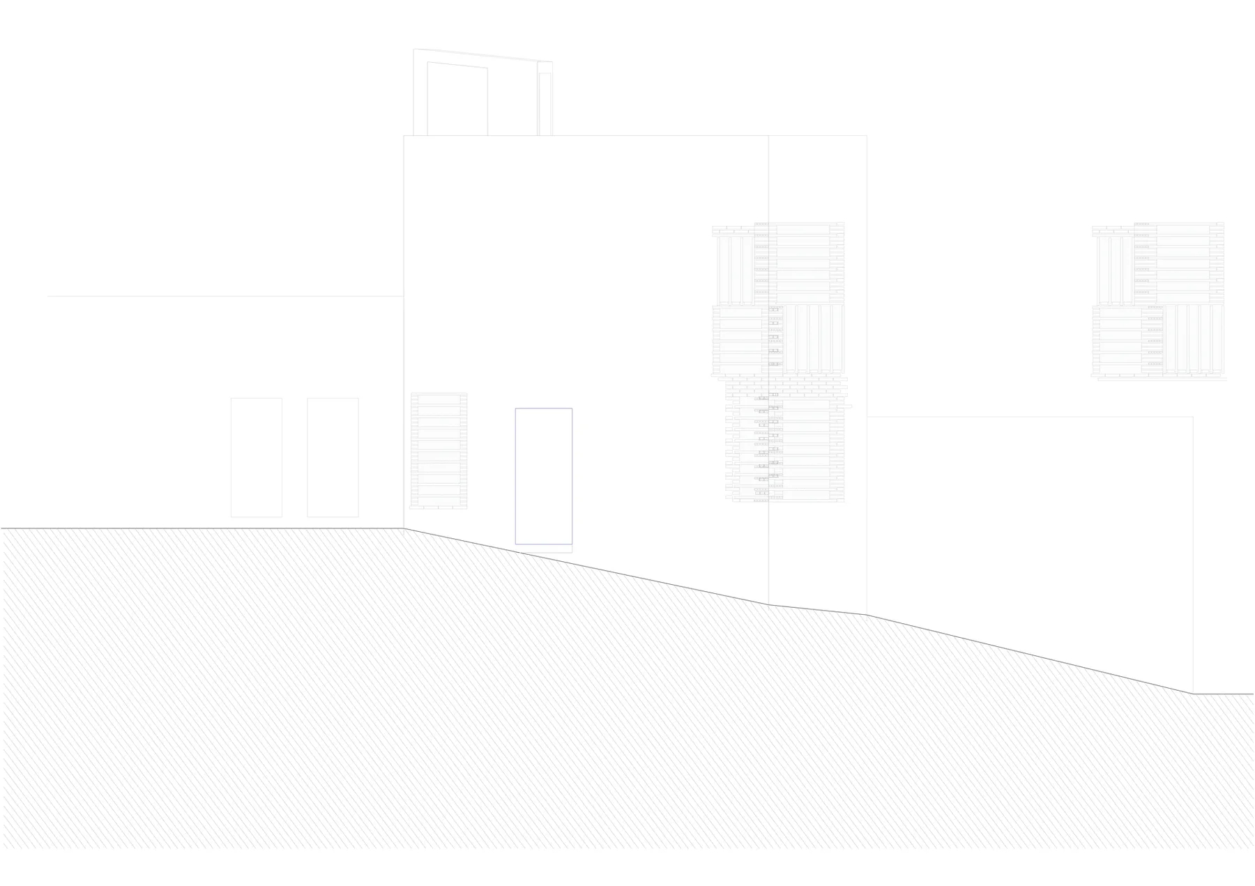 Dado el tamaño reducido de la parcela, menos de 50 m², se propone una casa que ocupe la totalidad del solar y agote la edificabilidad disponible. El proyecto, redactado en colaboración con el propietario y arquitecto Wolf Kherer, se organiza en un volumen único con dos fachadas completas orientadas al este y al oeste y una mirada norte y sur desde la azotea. La vivienda dispone de una única estancia principal en cada planta y una escalera de un solo tramo en la medianera norte, separada de las estancias mediante una batería de contenedores armario.