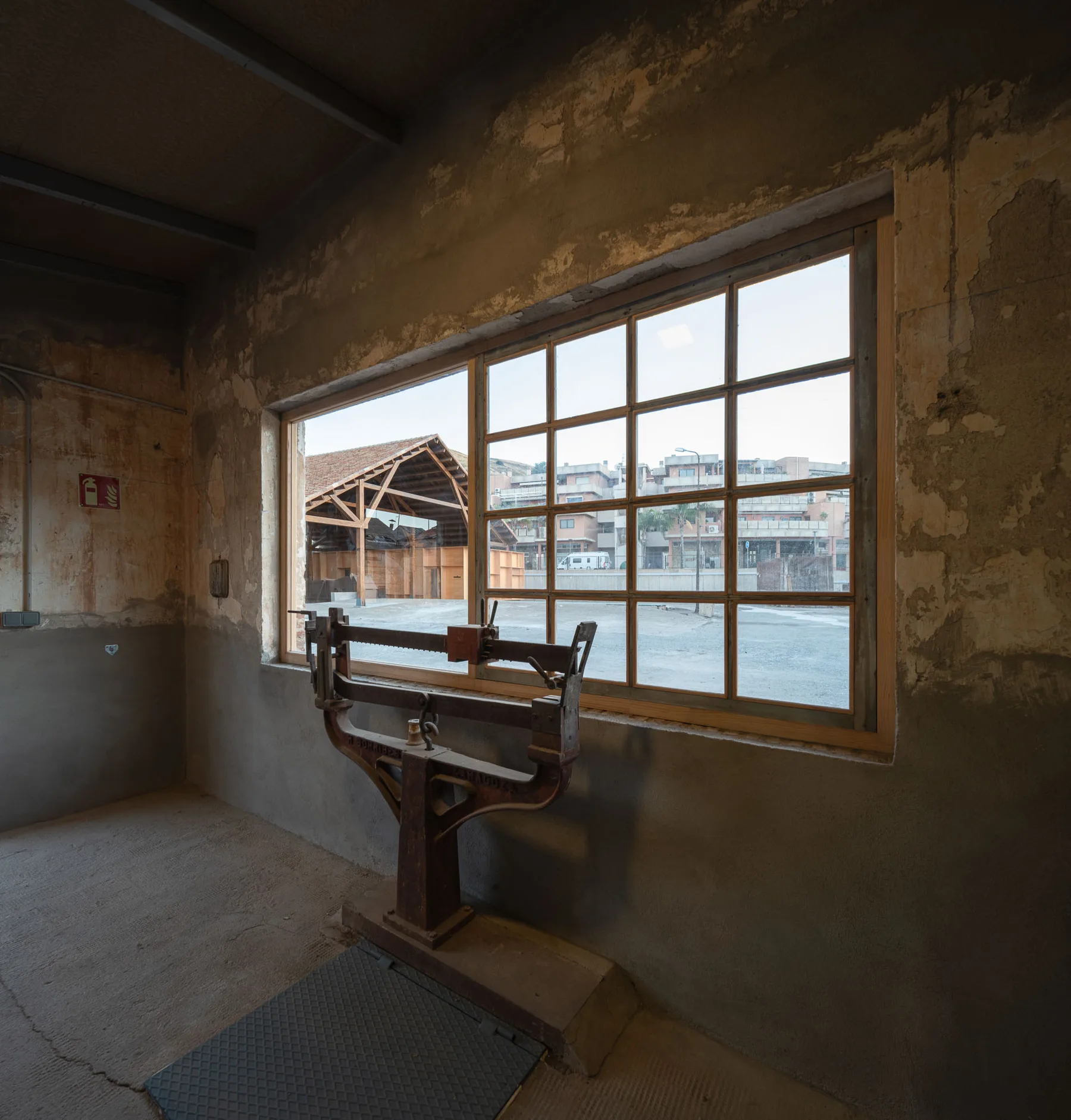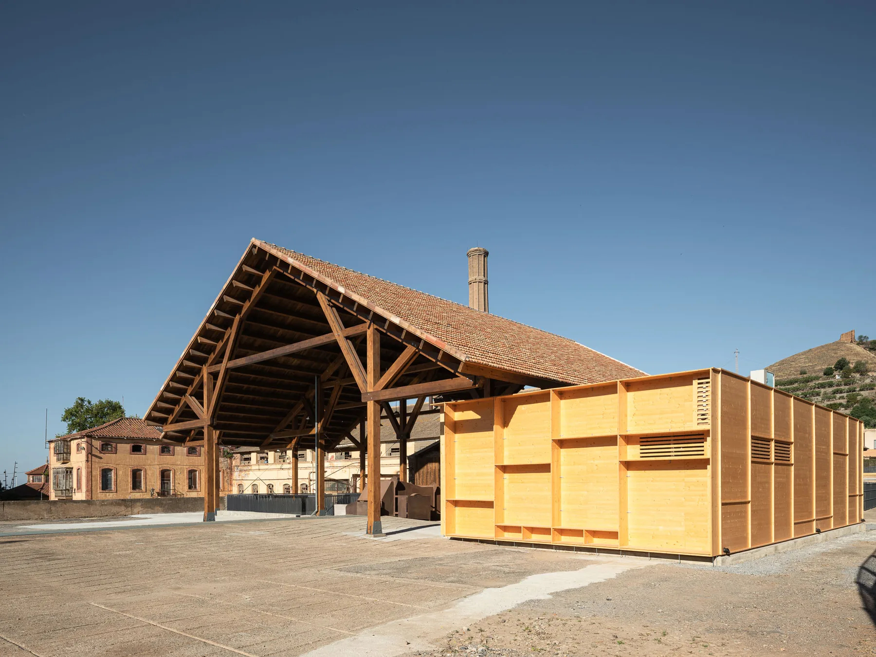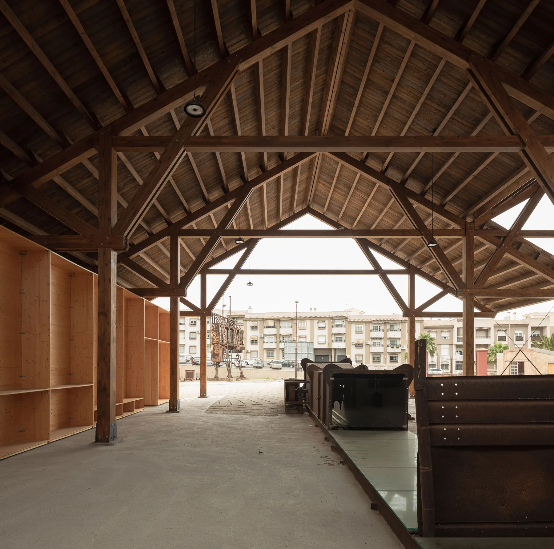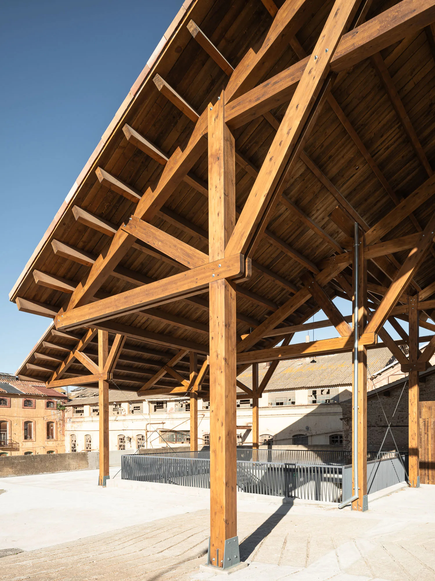 De forma complementaria se construye una pérgola de sombra, una estructura porticada a dos aguas de madera laminada inspirada en el sistema de soportes y cerchas de la nave cortadora. Bajo esta pérgola se coloca un módulo prefabricado con control de accesos, sala multiusos audiovisual, aseos y cuarto técnico. Las fachadas de este pabellón se diseñan como estanterías y paneles expositivos con información del Museo, materiales documentales y fotografías históricas. Un elevador conecta los dos niveles principales facilitando la accesibilidad sin alterar las características formales del BIC existente.