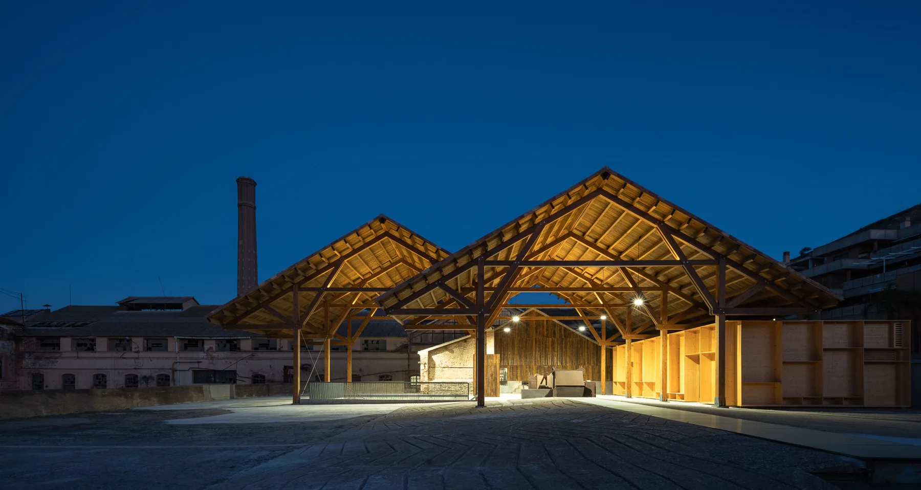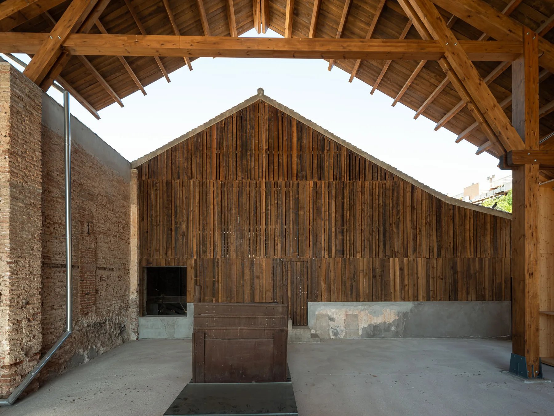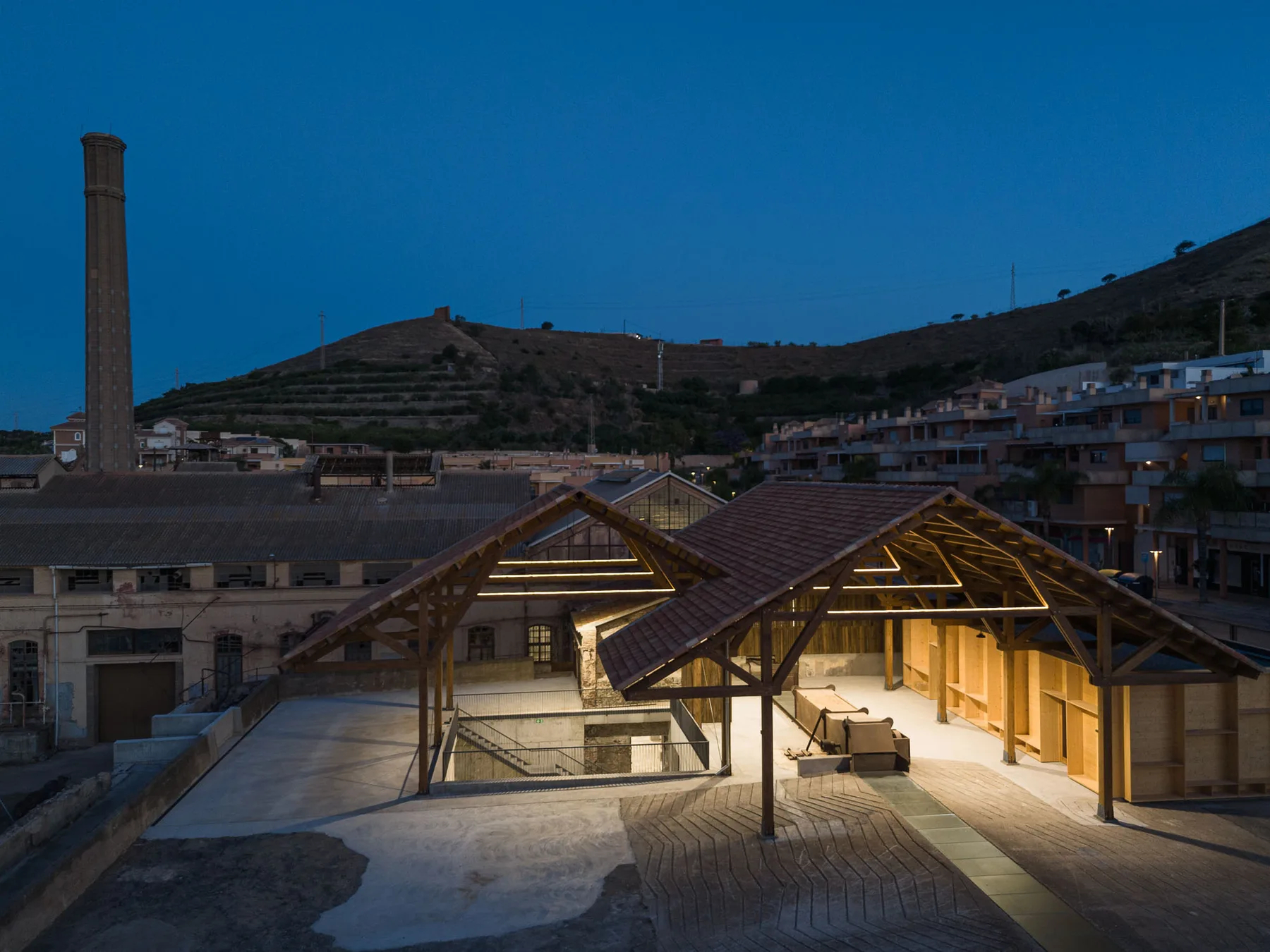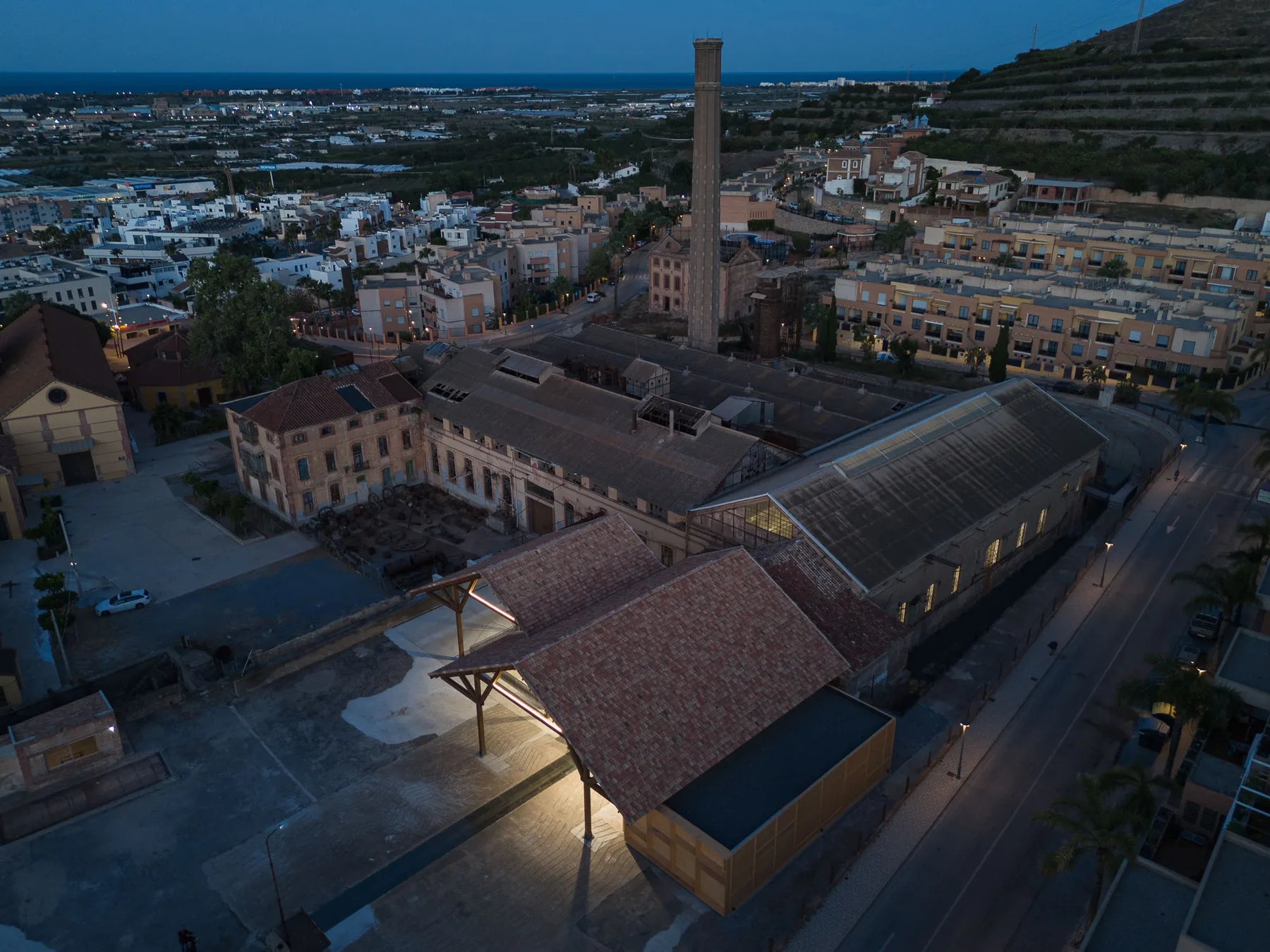 De forma complementaria se construye una pérgola de sombra, una estructura porticada a dos aguas de madera laminada inspirada en el sistema de soportes y cerchas de la nave cortadora. Bajo esta pérgola se coloca un módulo prefabricado con control de accesos, sala multiusos audiovisual, aseos y cuarto técnico. Las fachadas de este pabellón se diseñan como estanterías y paneles expositivos con información del Museo, materiales documentales y fotografías históricas. Un elevador conecta los dos niveles principales facilitando la accesibilidad sin alterar las características formales del BIC existente.