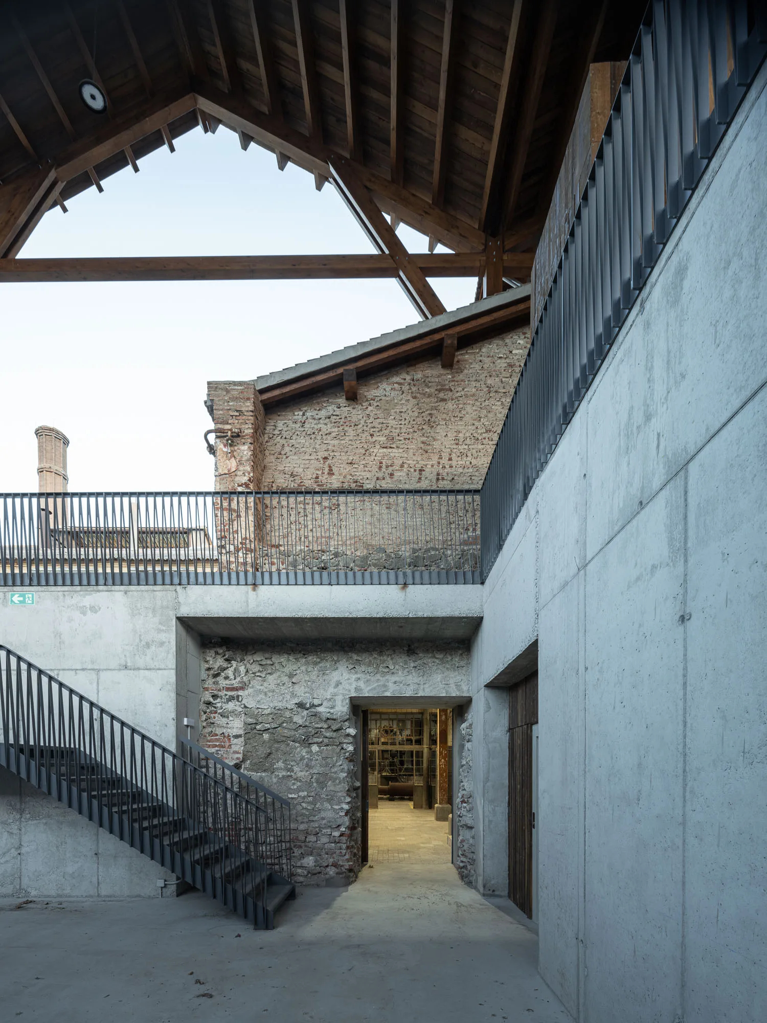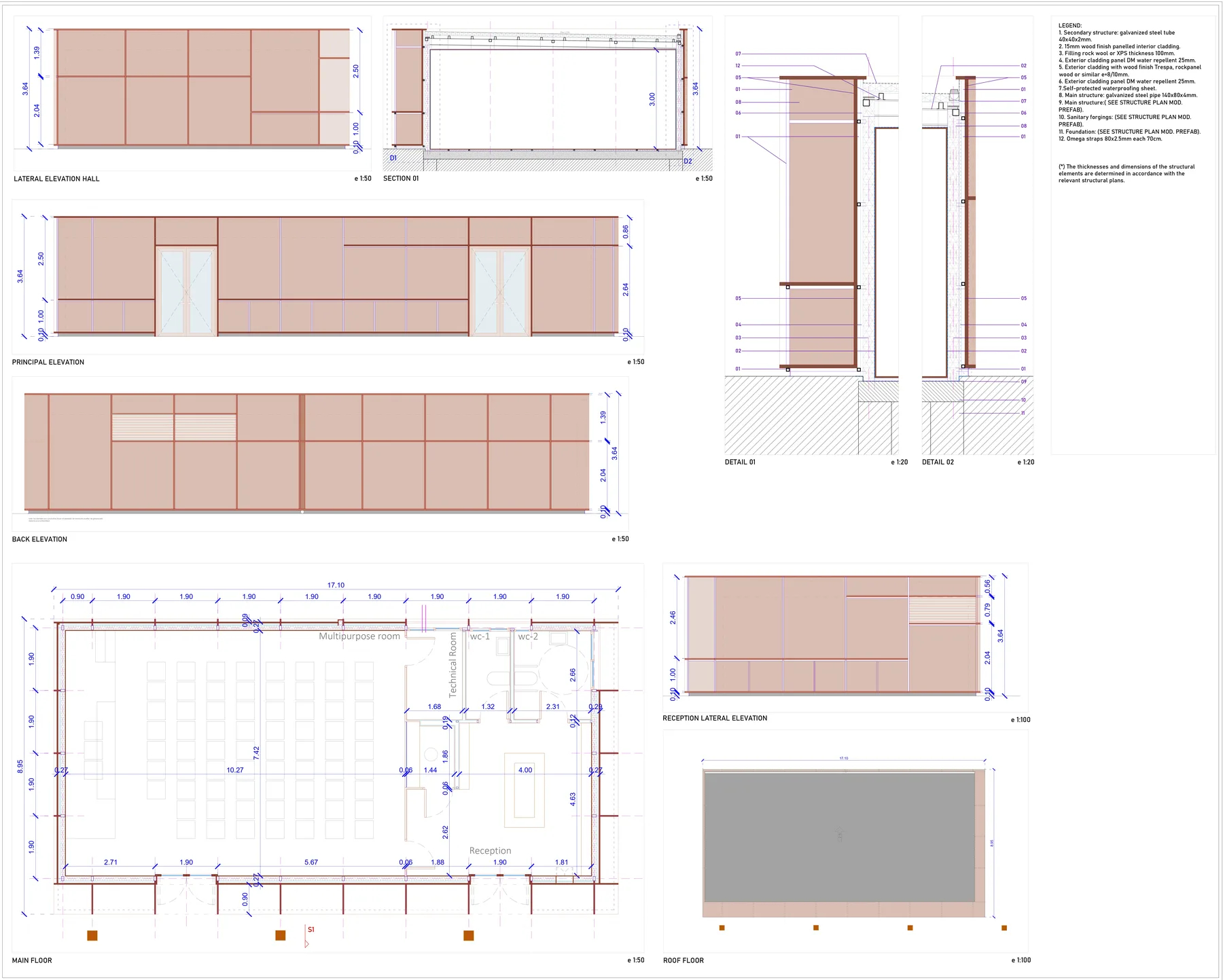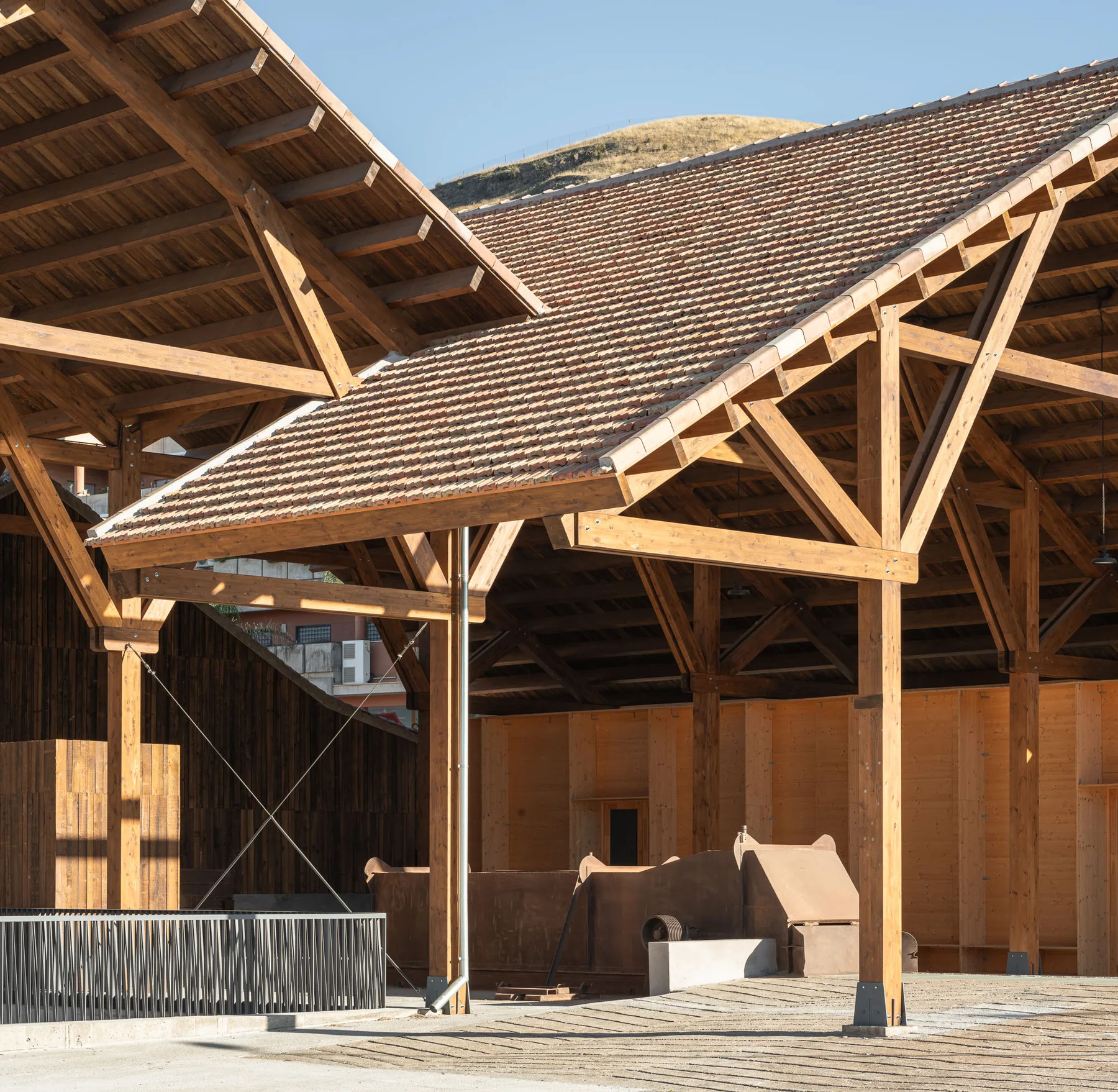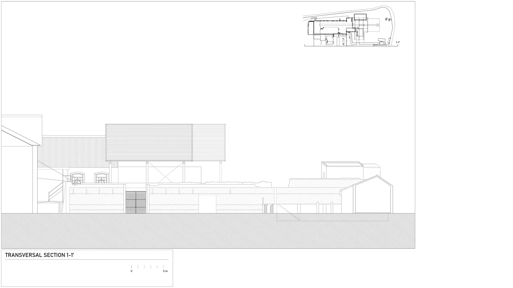 De forma complementaria se construye una pérgola de sombra, una estructura porticada a dos aguas de madera laminada inspirada en el sistema de soportes y cerchas de la nave cortadora. Bajo esta pérgola se coloca un módulo prefabricado con control de accesos, sala multiusos audiovisual, aseos y cuarto técnico. Las fachadas de este pabellón se diseñan como estanterías y paneles expositivos con información del Museo, materiales documentales y fotografías históricas. Un elevador conecta los dos niveles principales facilitando la accesibilidad sin alterar las características formales del BIC existente.