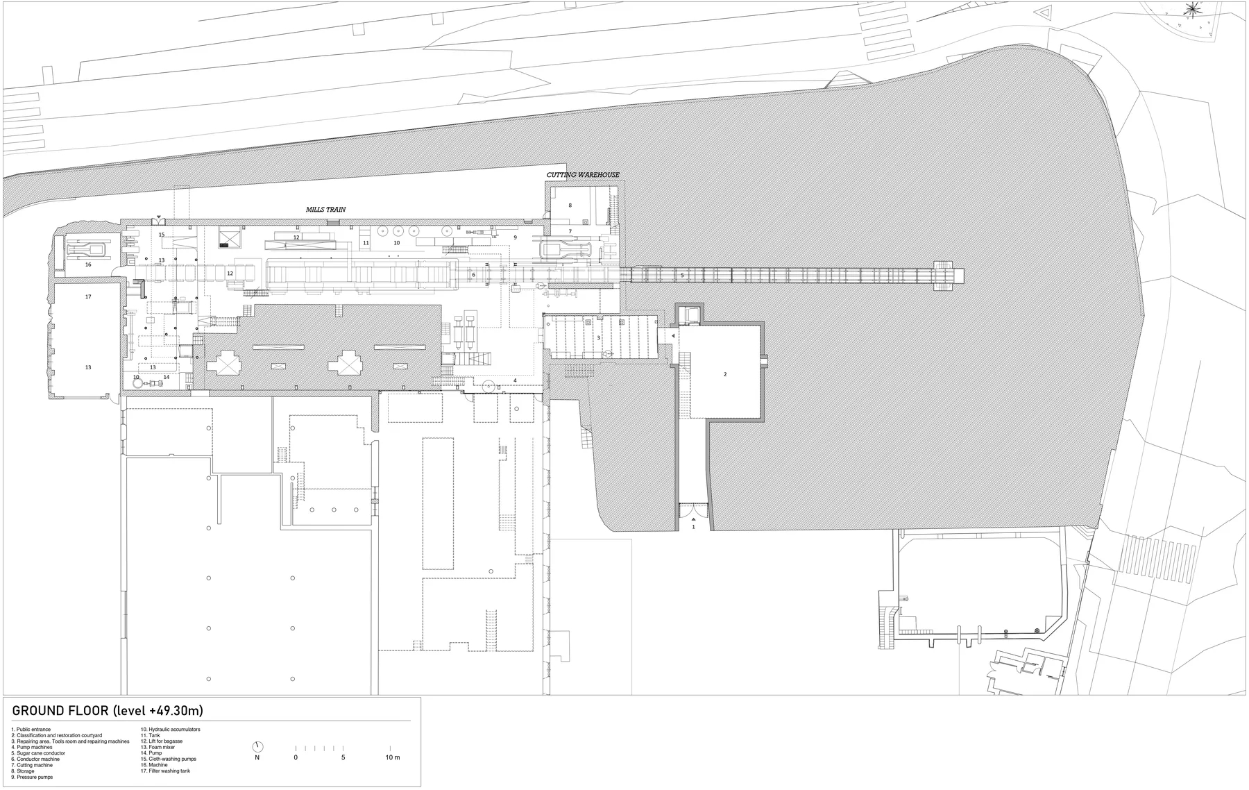 La propuesta plantea una estrategia basada en dos iniciativas para la apertura del Museo Industrial del Azúcar en la Nave del Tren de Molinos y su entorno en el recinto de la Fábrica del Pilar. La primera se centra en la intervención arquitectónica en la Nave del Tren de Molinos y naves anexas, incluyendo acondicionamiento de las naves, reparaciones de fachadas y cubiertas, recuperación de huecos, colocación de carpinterías e iluminación natural y artificial. Se han nivelado y regularizado las zonas pisables con bandas de color que dibujan los recorridos de visita, y se han repuesto elementos arquitectónicos y componentes de la maquinaria del Tren de Molinos para completar la lectura de su funcionamiento original.