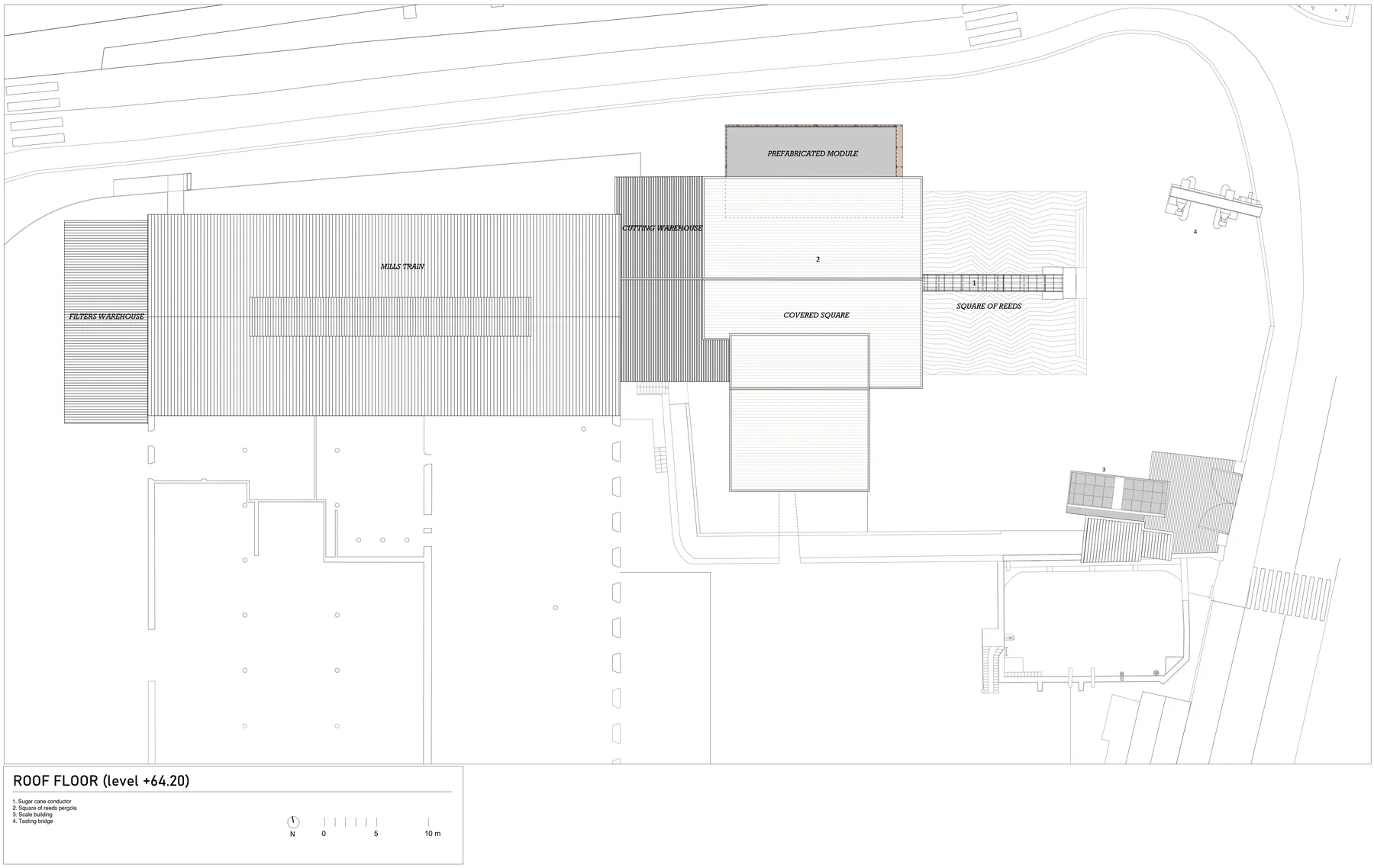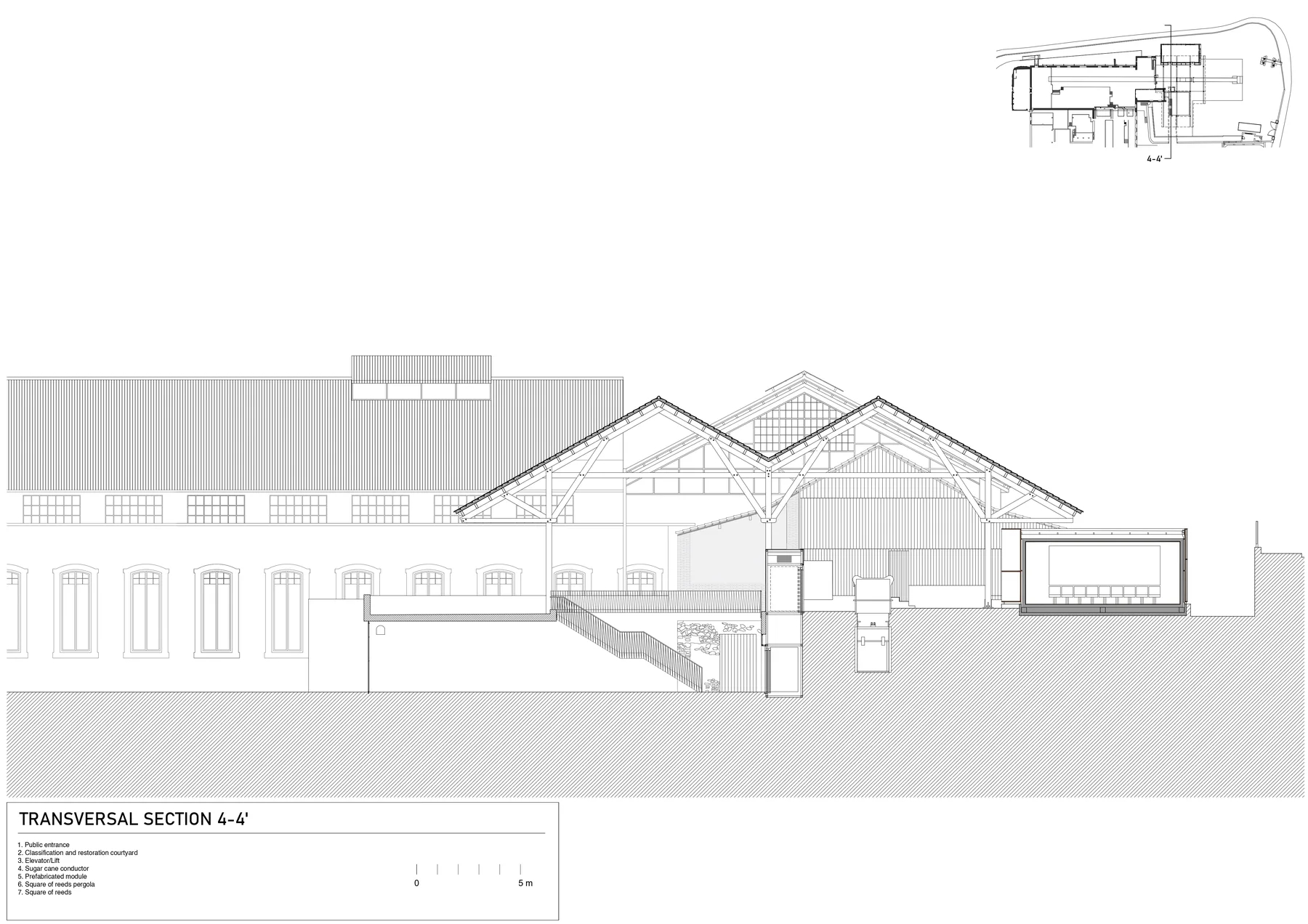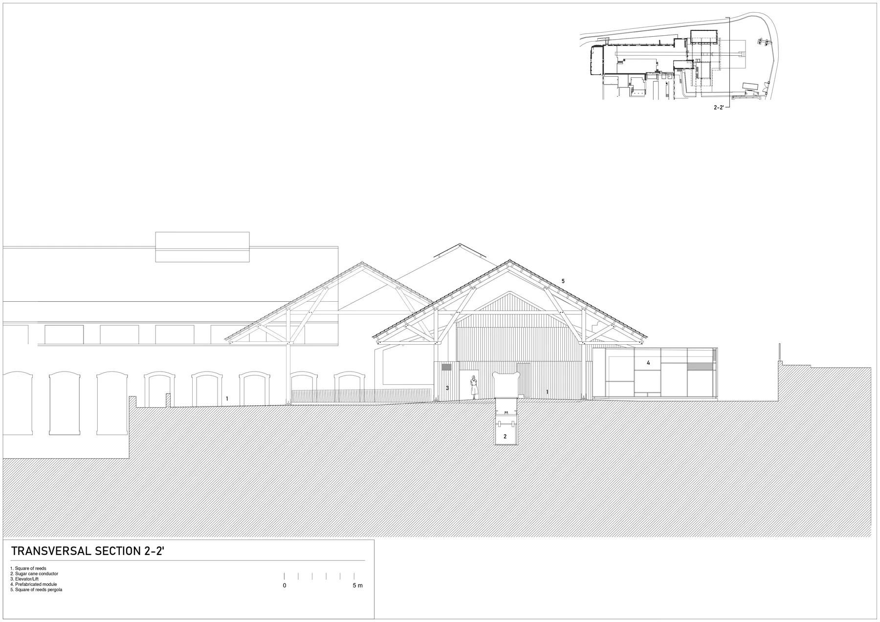La segunda iniciativa incluye un área de acceso en la fachada este de la Nave Cortadora de Cañas, con un pabellón prefabricado de gestión y recepción, y un patio de tipo inglés que aloja un área de trabajo técnico para la recuperación y clasificación de enseres y maquinaria. Se ha construido un pasaje, una galería expositiva de conexión entre los espacios, a través de la nave de taller mecánico existente.